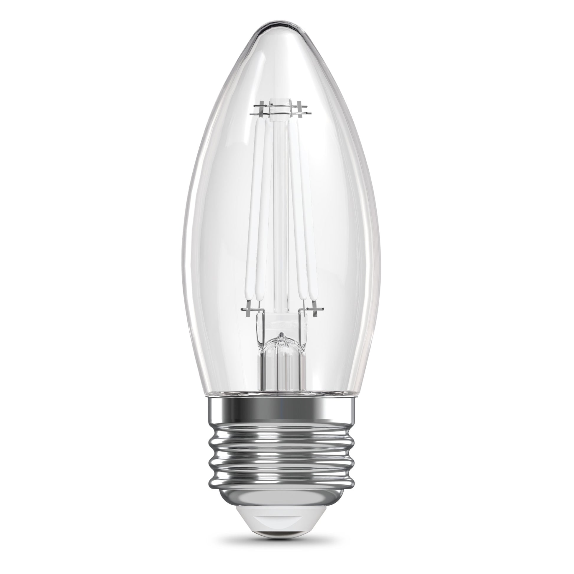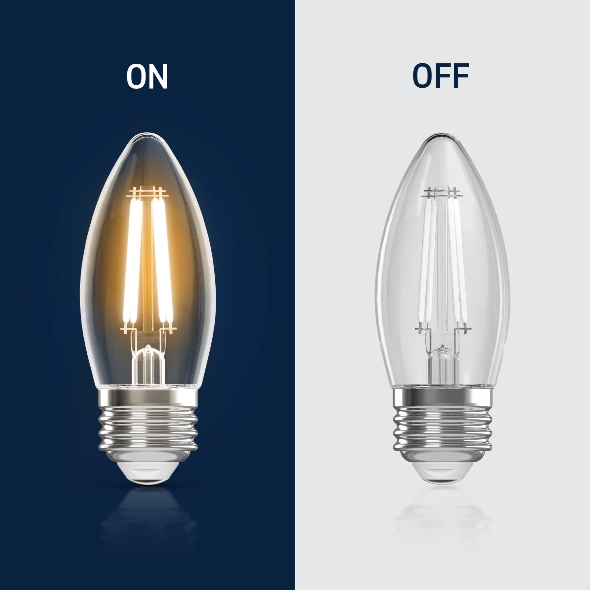 Refresh your lighting to fit your aesthetic with our White Filament LED Switchable White bulb. Equipped with low-profile, white coated filament design, these clear bulbs give off stunning, stylish illumination while on and blend seamlessly into your decor while off. The candle shape brings a high-end ambiance to your fixtures. Toggle between Soft White (2700K), Warm White (3000K), Bright White (3500K), Cool White (4000K), and Daylight (5000K) to suit any room, whether you’re going for cozy and inviting, bright and energizing, or matching other lighting in the room. The remarkable 90+ Color Rendering Index (CRI) makes colors appear more vivid and true-to-life, enhancing the beauty of your home’s decor and making everything look its best for up to 20,000 hours. This 300-lumen bulb has a medium-size E26 base, making it an easy upgrade from traditional 40W incandescent bulbs in almost any fixture. Replacements are fewer and further between with eco-friendly, LED bulb technology. Whether it’s in your living room, bedroom, or dining room, enjoy flicker-free, sustainable lighting that elevates your fixtures with effortlessly sleek style.