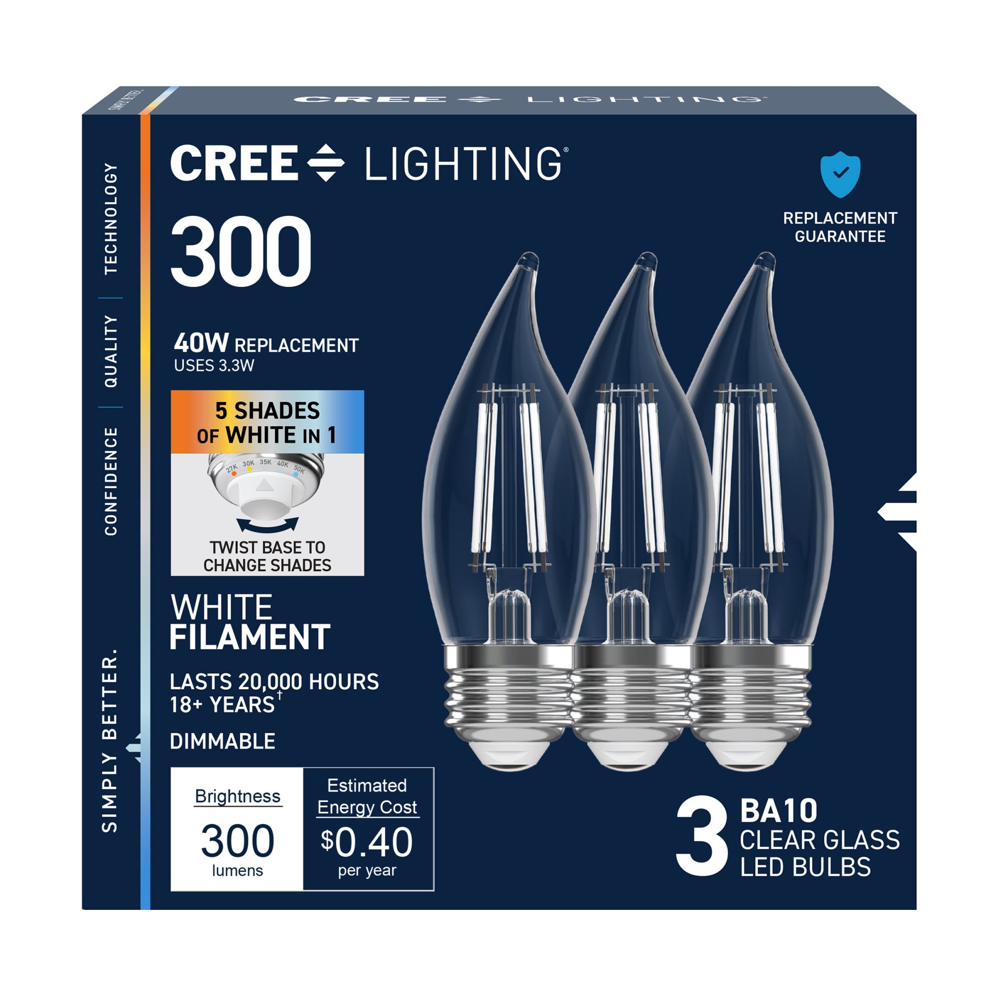 Refresh your lighting to fit your aesthetic with our White Filament LED Chandelier Switchable White bulb. Equipped with low-profile, white coated filament design, these clear bulbs give off stunning, stylish illumination while on and blend seamlessly into your decor while off. The candle shape brings a high-end ambiance to your fixtures. Toggle between Soft White (2700K), Warm White (3000K), Bright White (3500K), Cool White (4000K), and Daylight (5000K) to suit any room, whether you’re going for cozy and inviting, bright and energizing, or matching other lighting in the room. The remarkable 90+ Color Rendering Index (CRI) makes colors appear more vivid and true-to-life, enhancing the beauty of your home’s decor and making everything look its best for up to 20,000 hours. This 300-lumen bulb has a medium-size E26 base, making it an easy upgrade from traditional 40W incandescent bulbs in almost any fixture. Replacements are fewer and further between with eco-friendly, LED bulb technology. Whether it’s in your living room, bedroom, or dining room, enjoy flicker-free, sustainable lighting that elevates your fixtures with effortlessly sleek style.