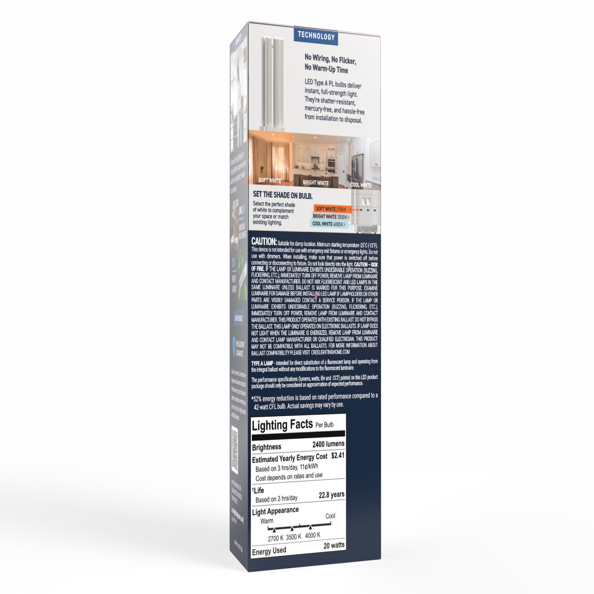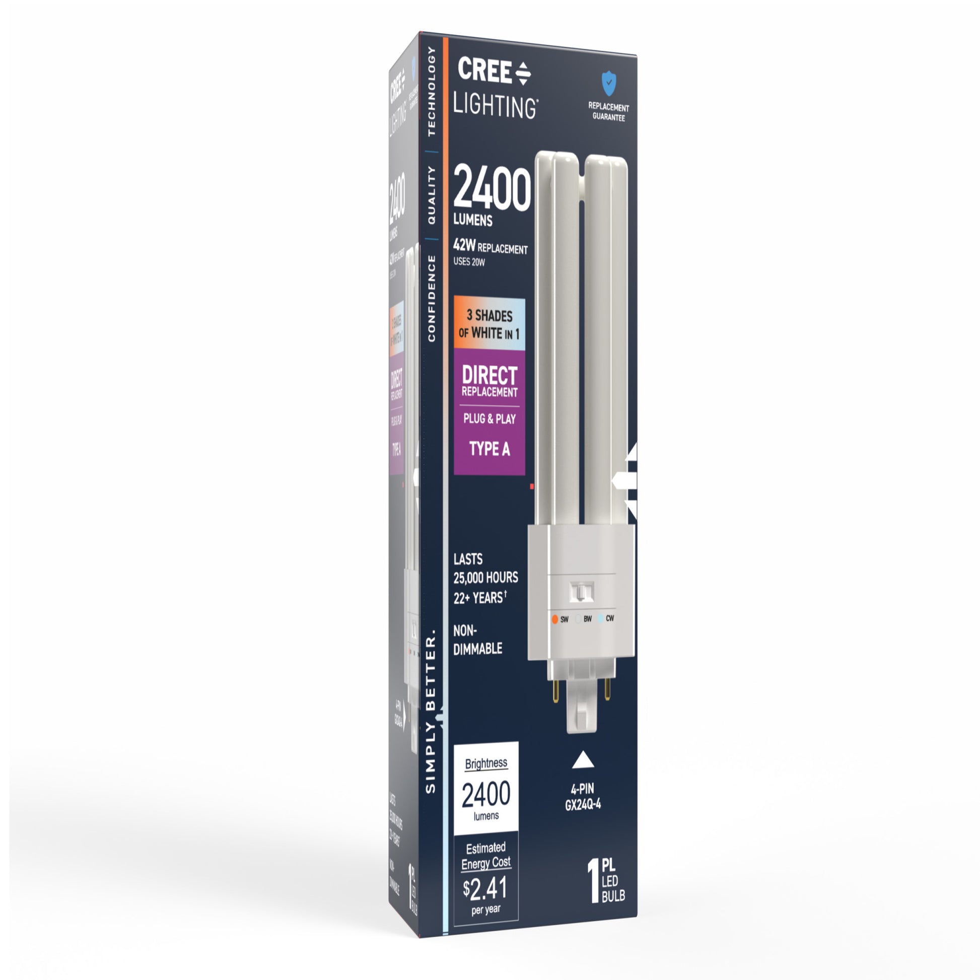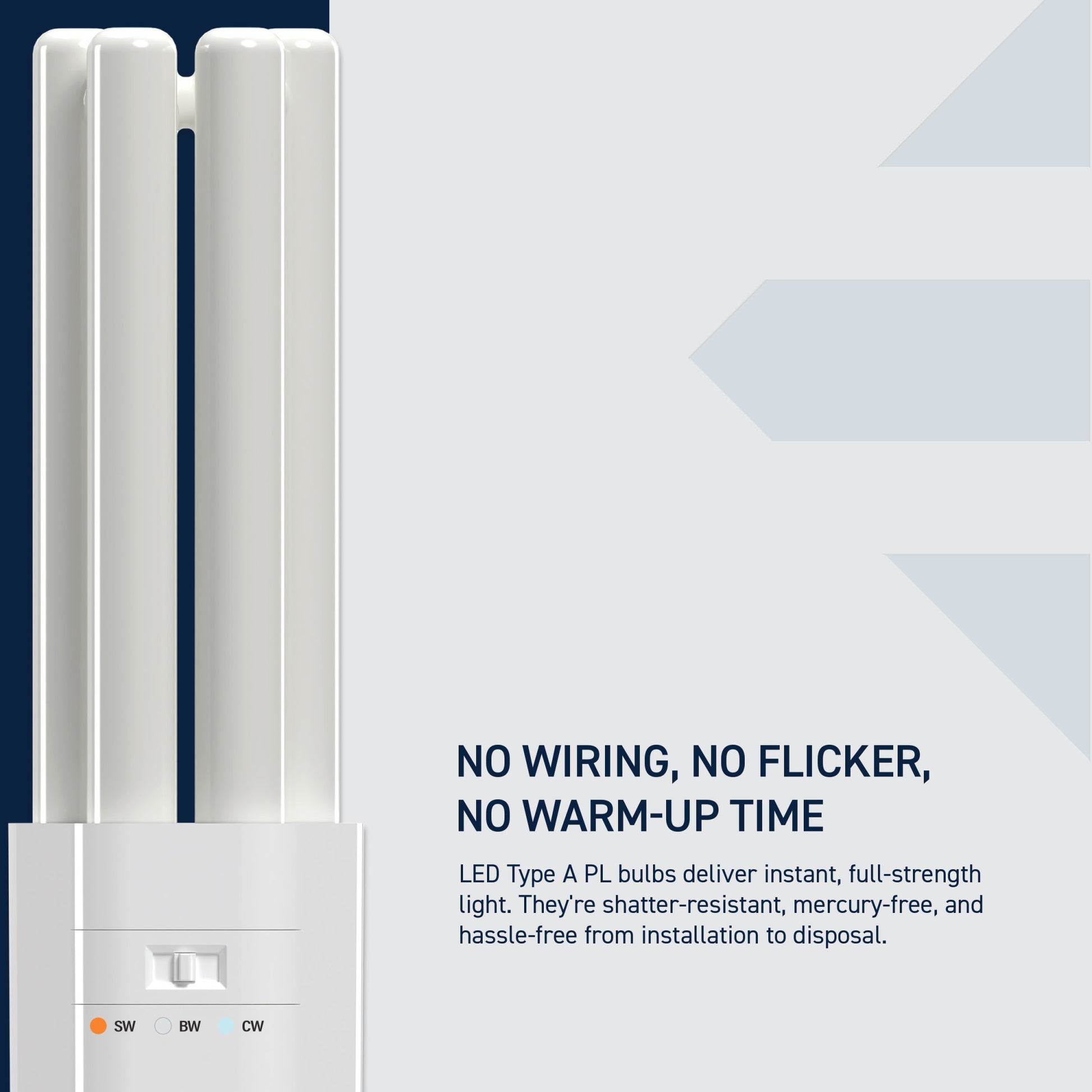 Upgrade your lighting without changing your fixtures. This 42W Replacement Triple Twin Tube PL LED Bulb offers three color temperatures—2700K, 3500K, and 4000K—in one easy-to-install bulb. With a GX24q-3 base, it’s a smart retrofit for commercial recessed fixtures and downlights, delivering bright, flicker-free light with only 20W of energy. With a 25,000-hour lifespan and mercury-free construction, it’s a long-lasting upgrade built for comfort and performance.