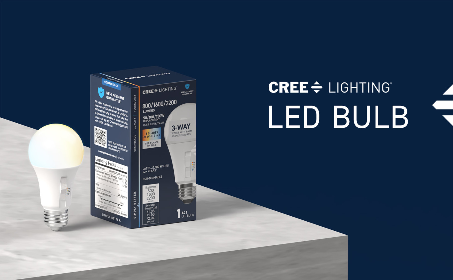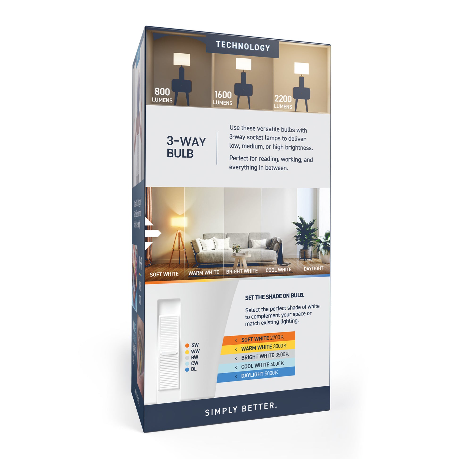 Ultimate versatility is at your fingertips with this Cree 3-way 5-in-1 Switchable White Light LED Bulb. This bulb works in 3-Way lamps and fixtures to switch between 800, 1600, and 2200 Lumens, so the brightness is just right at any time of day or night. Choose between Soft White (2700K), Warm White (3000K), Bright White (3500K), Cool White (4000K), or Daylight (5000K) for any mood in any space. Low Blue technology filters harsh blue light that can cause eye strain, headaches, and disrupt sleep. The medium-sized E26 base makes for a convenient upgrade, and the brilliant 90+ Color Rendering Index (CRI) makes the colors in your home appear more vivid and true-to-life, enhancing the beauty of your décor. Built to last with an impressive 25,000-hour lifespan, this energy-efficient LED saves you money and time, reducing replacements and energy costs by up to 83.7% compared to traditional 50/100/150W incandescent bulbs. Whether it's in your reading lamp or providing adjustable mood lighting in the living room, enjoy flicker-free, eco-friendly lighting that's mercury-free and designed for sustainability.