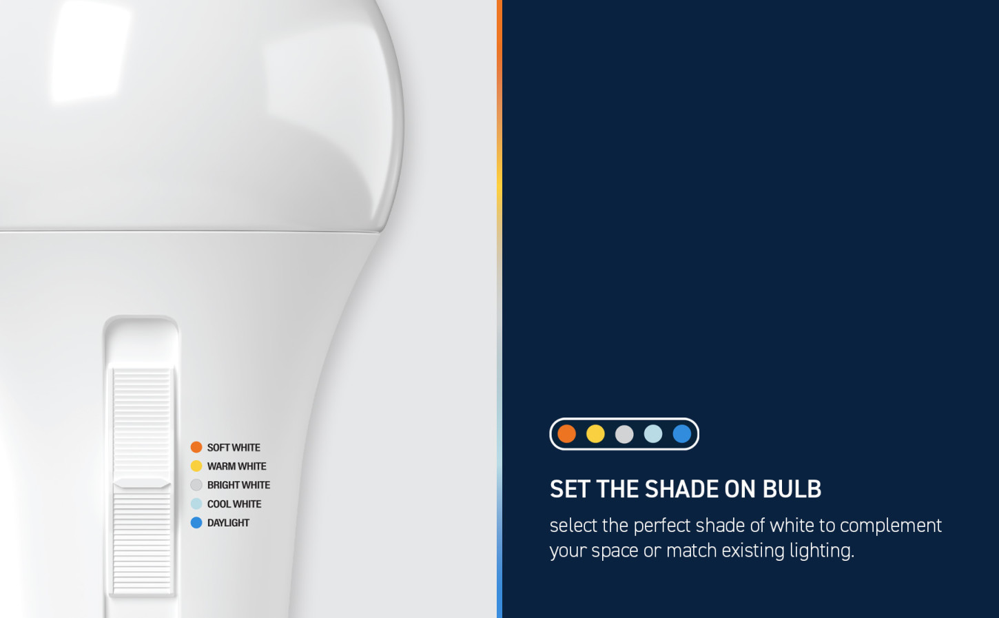 - Choose Soft White (2700K), Warm White (3000K), Bright White (3500K), Cool White (4000K), or Daylight (5000K)
