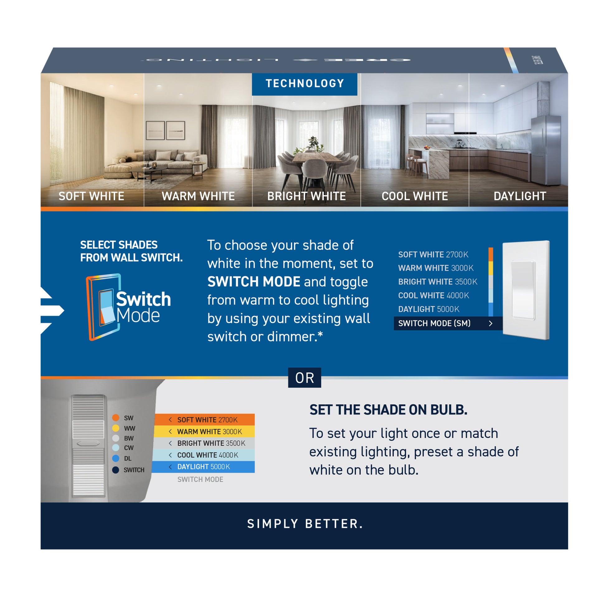 - Choose Soft White (2700K), Warm White (3000K), Bright White (3500K), Cool White (4000K), or Daylight (5000K)