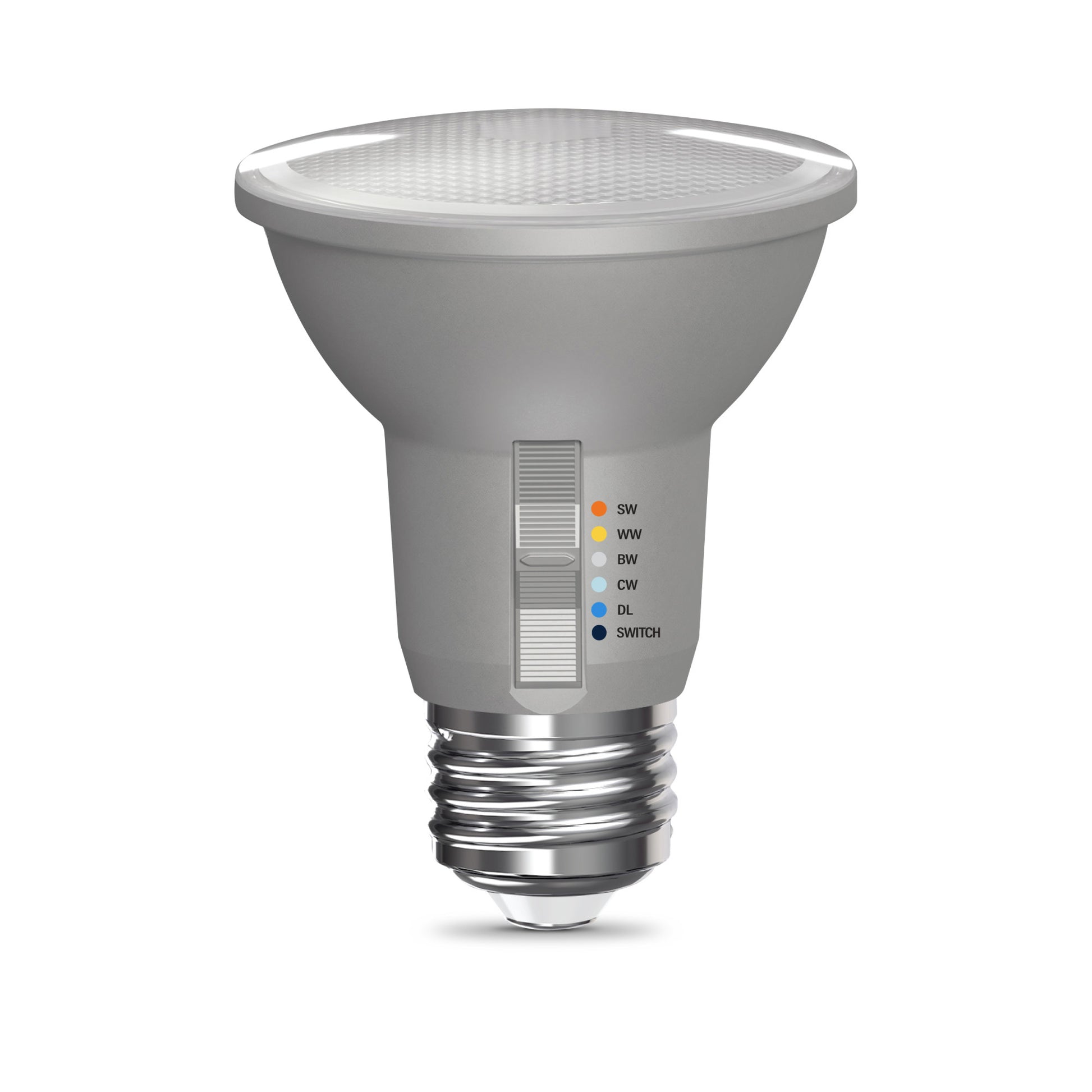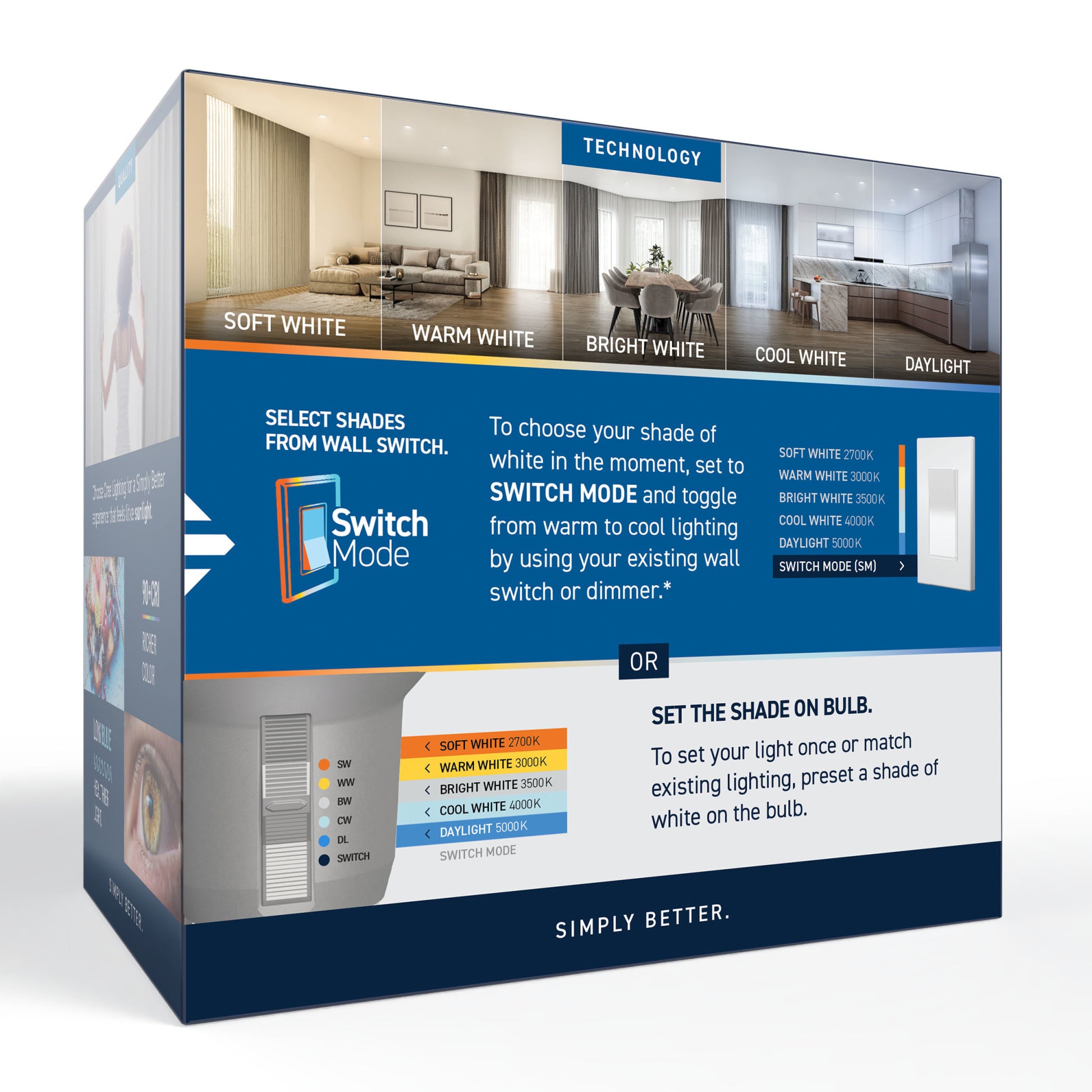 Upgrade your lighting game with our Reflector 5 Shades + Switch Mode LED Bulb. Preset Soft White (2700K), Warm White (3000K), Bright White (3500K), Cool White (4000K), and Daylight (5000K) before installation or select Switch Mode to toggle between shades anytime with your existing wall switch. Low Blue technology filters harsh out blue light that can cause eye strain, headaches, and disrupt sleep. With a remarkable 90+ Color Rendering Index (CRI), colors appear more vivid and true-to-life, enhancing the beauty of your home’s décor and making everything look its best. Built to last with an impressive 25,000-hour lifespan, this energy-efficient LED saves you money and time, reducing replacements and energy costs compared to traditional 50W incandescent bulbs. Featuring a medium E26 base, it’s compatible with most fixtures, making upgrades effortless. The bulb's dimmable design lets you set the mood with a flick of your wall switch, whether it’s on your patio, in the garage, or lighting up the living room in security, recessed, and track lighting fixtures. Illuminate your world with a bulb that combines comfort, clarity, and reliability in one brilliant package.