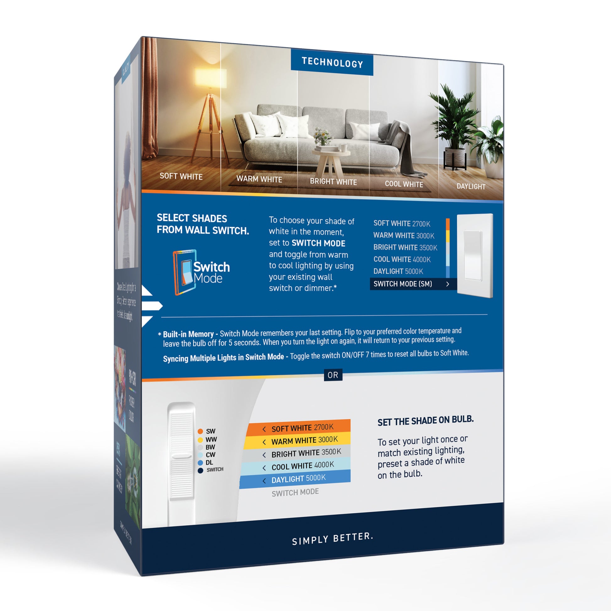 Upgrade your lighting game with our 5 Shade + Switch Mode Switchable White LED Bulb. Preset Soft White (2700K), Warm White (3000K), Bright White (3500K), Cool White (4000K), or Daylight (5000K) before installation, or choose Switch Mode to use your wall switch to go from energizing light in the daytime to relaxing light at night. With a remarkable 90+ Color Rendering Index (CRI), colors appear more vivid and true-to-life, enhancing the beauty of your home’s décor and making everything look its best. Built to last with an impressive 25,000-hour lifespan, this energy-efficient LED saves you money and time, reducing replacements and energy costs compared to a traditional 60W incandescent bulb. With a medium-sized E26 base, this dimmable bulb provides an easy upgrade in most fixtures. Whether it’s your living room, bedroom, or kitchen, enjoy flicker-free, eco-friendly lighting that’s mercury-free and designed for sustainability. Illuminate your world with a bulb that combines comfort, clarity, and reliability—all in one brilliant package.