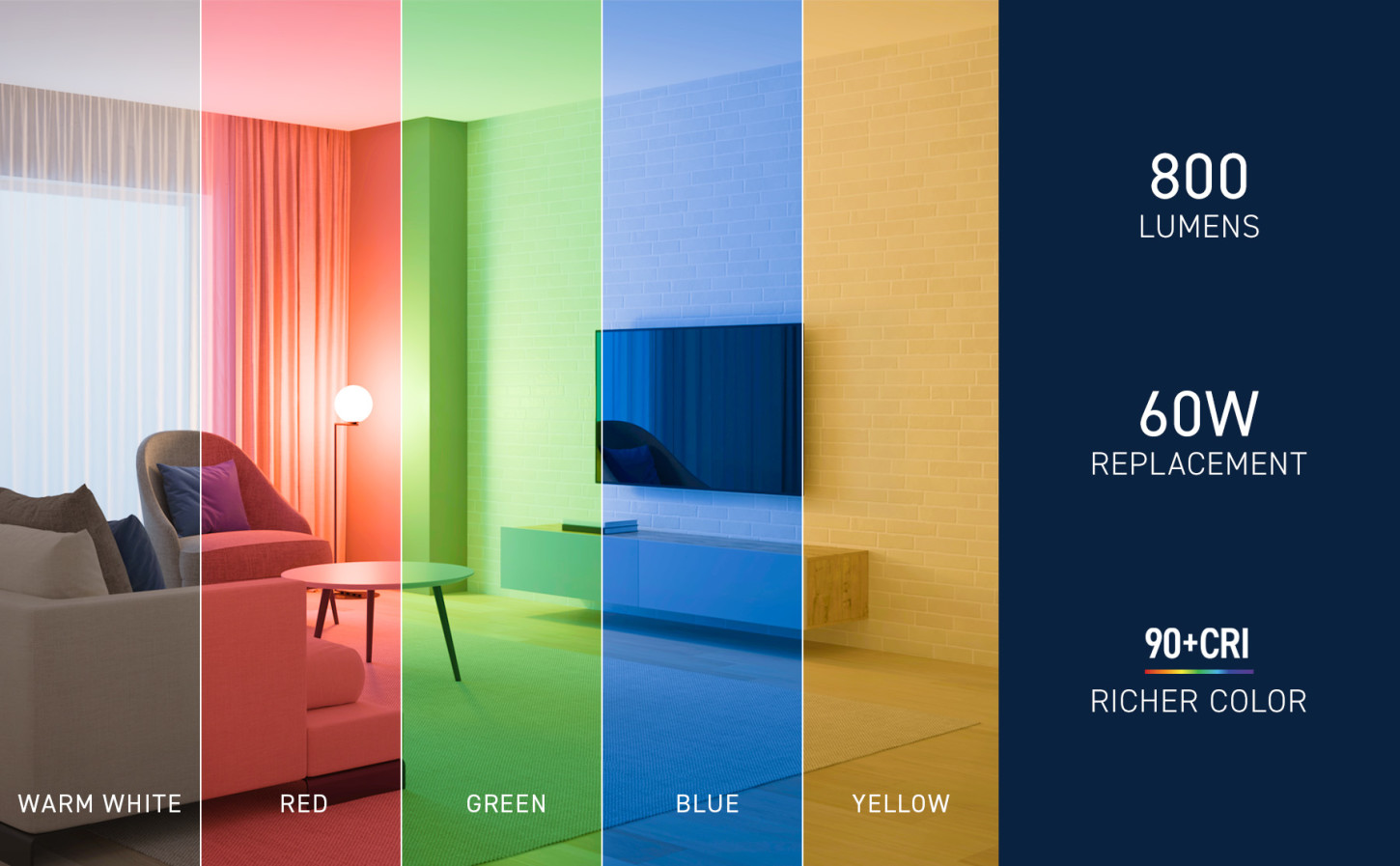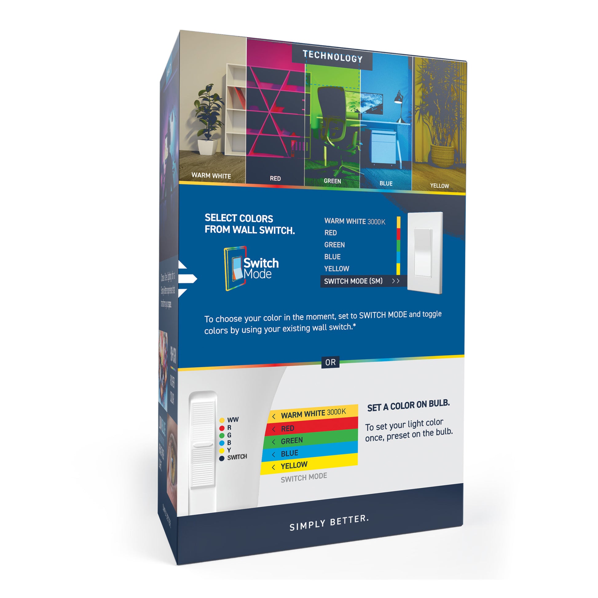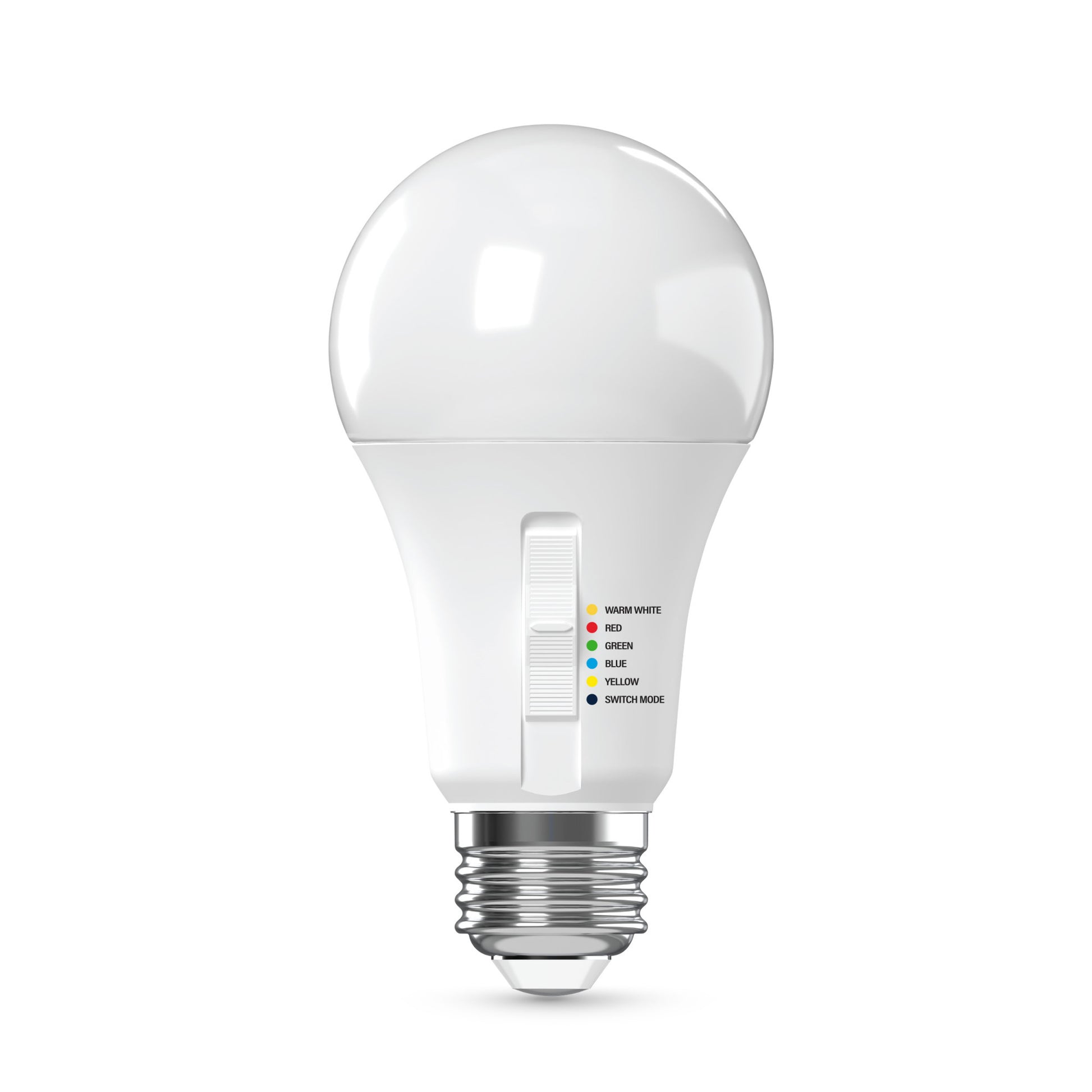 - Toggle between Red, Green, Blue, Yellow, and White on the bulb or with your existing wall switch