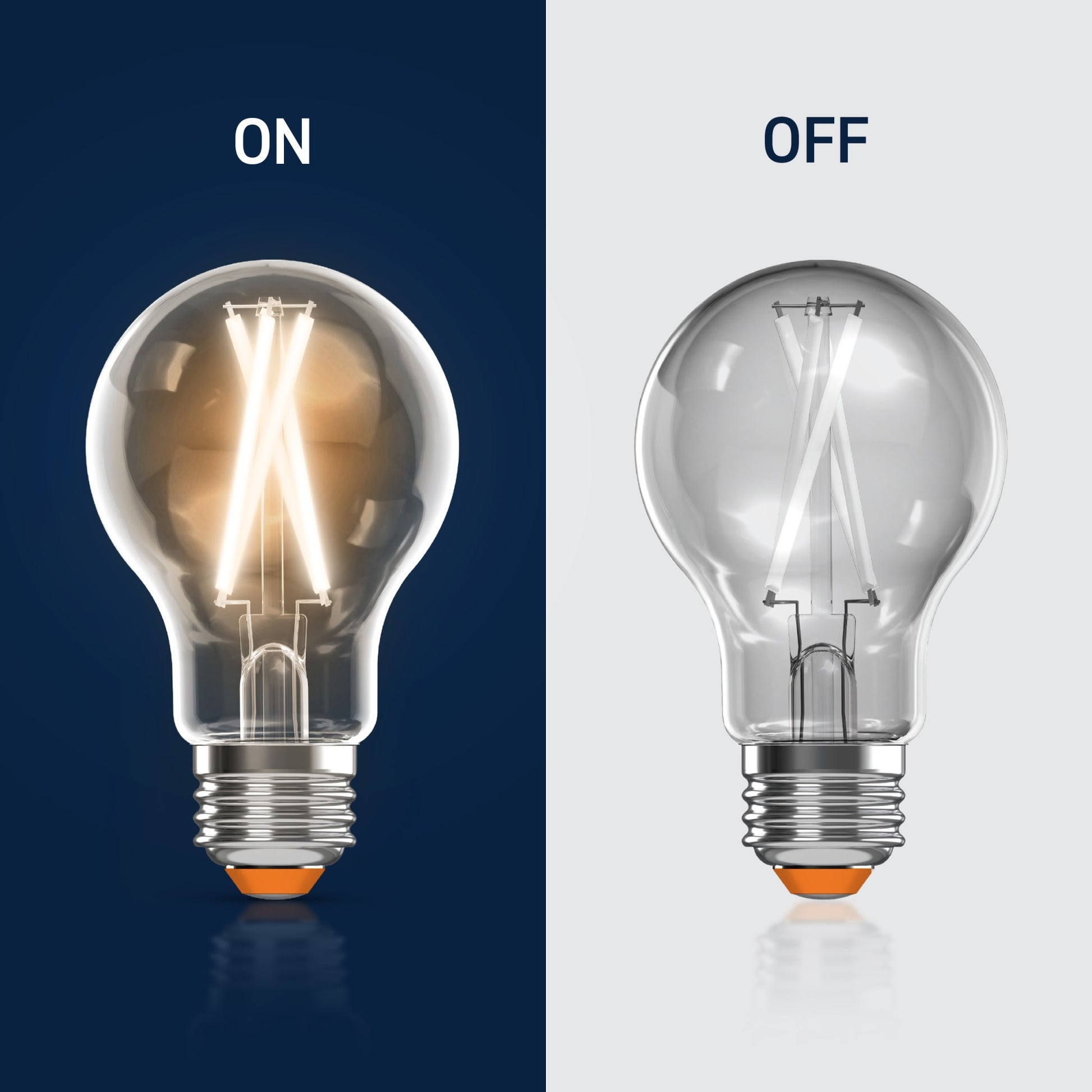 Refresh your lighting to fit your aesthetic with our White Filament LED A19 Soft White bulb. Equipped with low-profile, white coated filament design, these clear glass bulbs give off stunning illumination while on and blend seamlessly into your decor while off. The Soft White (2700K) tone creates a warm, inviting atmosphere that makes any space feel like home for up to 20,000 hours. The remarkable 90+ Color Rendering Index (CRI) makes colors appear more vivid and true-to-life, enhancing the beauty of your home's decor and making everything look its best. This 800 Lumen bulb has a medium-size E26 base, making it an easy upgrade from traditional 60W incandescent bulbs in almost any fixture. Replacements are fewer and further between with eco-friendly, LED bulb technology that uses less energy than incandescent bulbs. Whether it's in your living room, bedroom, or reading nook, enjoy flicker-free, sustainable lighting that elevates your fixtures with effortlessly sleek style.