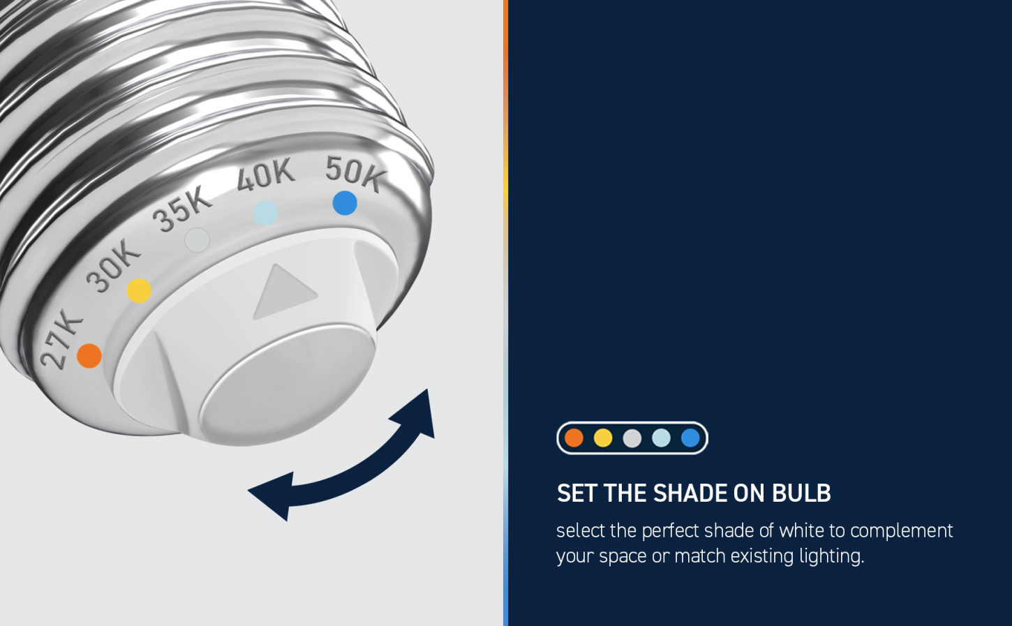 - Choose Soft White (2700K), Warm White (3000K), Bright White (3500K), Cool White (4000K), and Daylight (5000K)