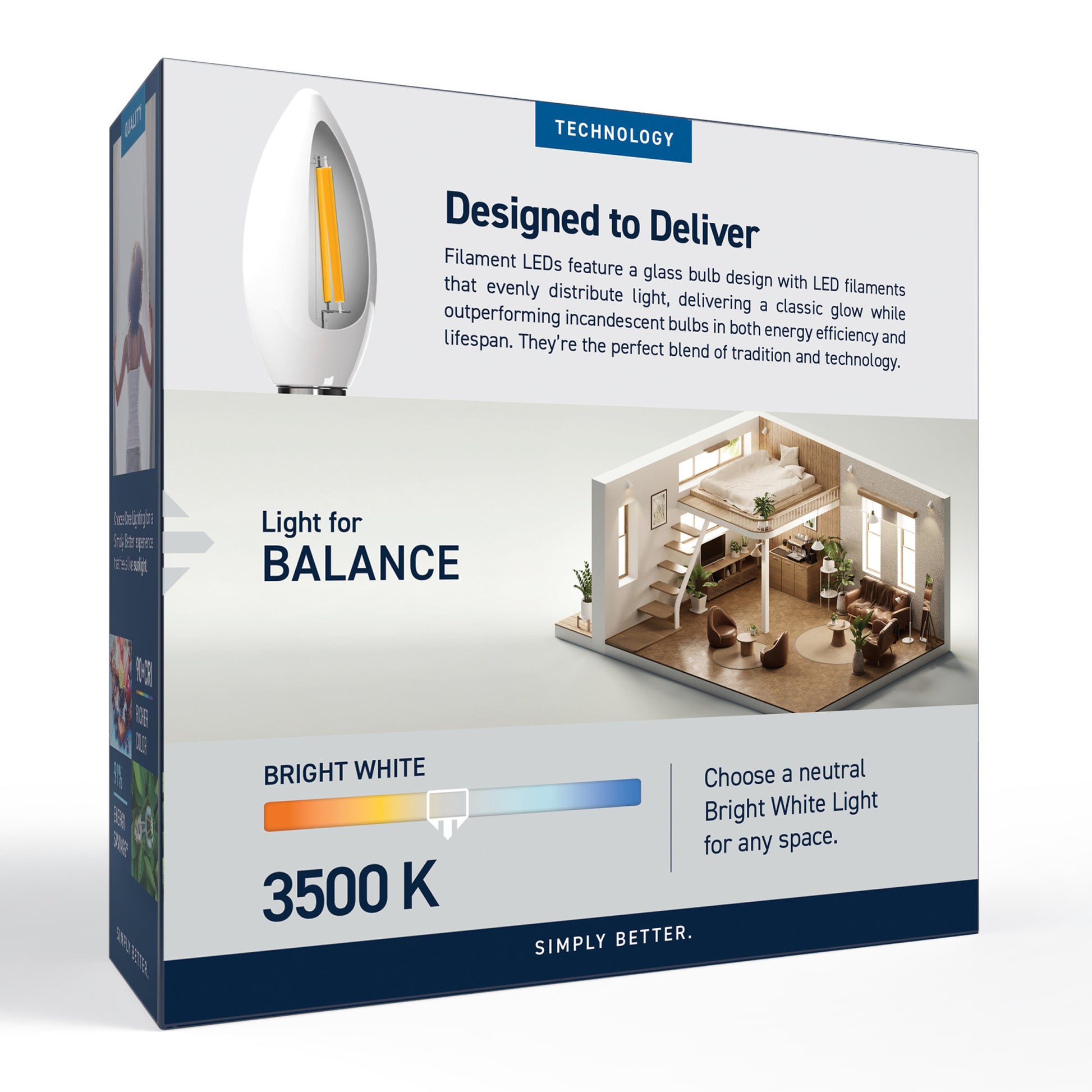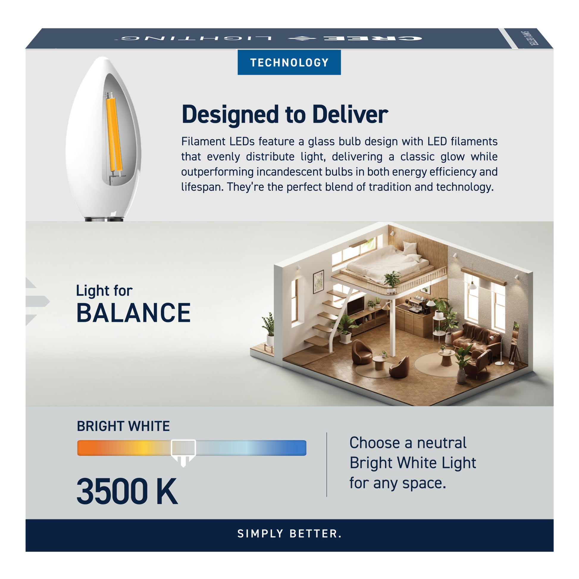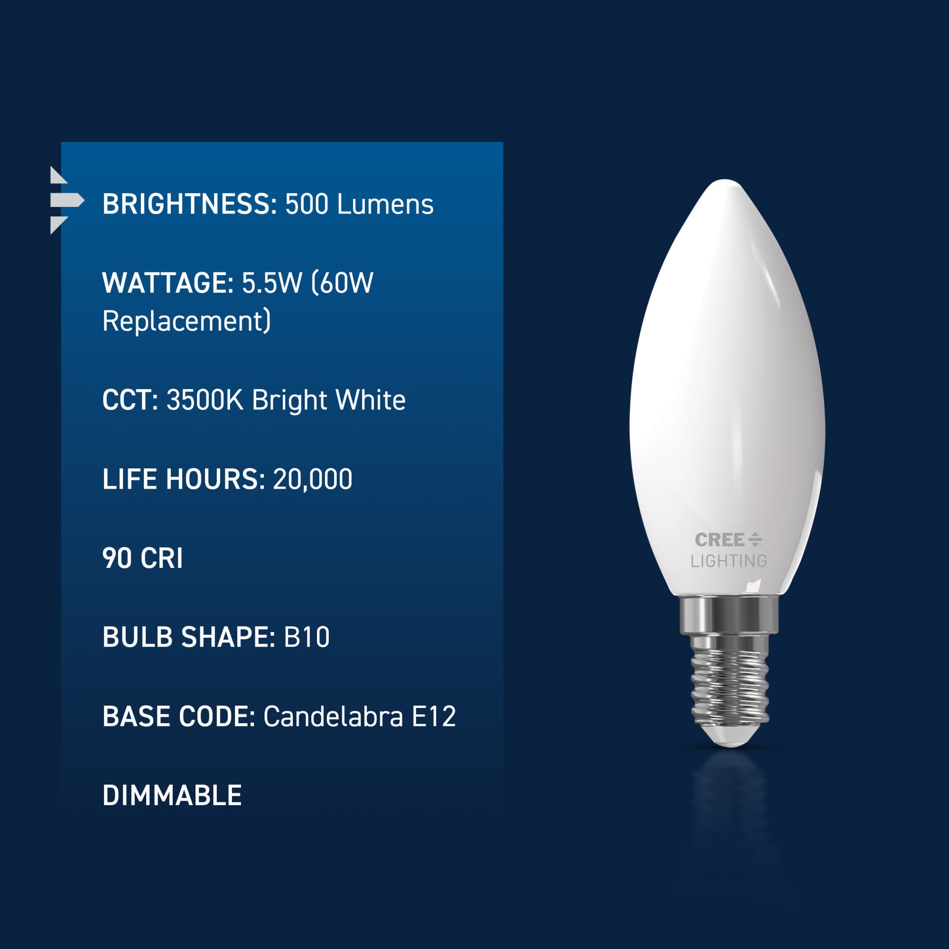 Upgrade your lighting game with our Chandelier Bright White LED Bulb, designed to deliver balanced, neutral efficiency with effortless style. Emitting a neutral Bright White light (3500K), this bulb strikes the perfect balance with a versatile light perfect for any room in the house. With a remarkable 90+ Color Rendering Index (CRI), colors appear more vivid and true-to-life, enhancing the beauty of your home’s décor and making everything look its best. Built to last with an impressive 20,000-hour lifespan, this energy-efficient LED saves you money and time, reducing replacements and energy costs by up to 90.8% compared to traditional 60W incandescent bulbs. This 500-lumen bulb has a Candelabra E12 base, and replacements are fewer and further between with eco-friendly, LED bulb technology. Its dimmable design lets you set the mood with a flick of your wall switch. Illuminate your world with a bulb that combines class, clarity, and reliability in one brilliant package.