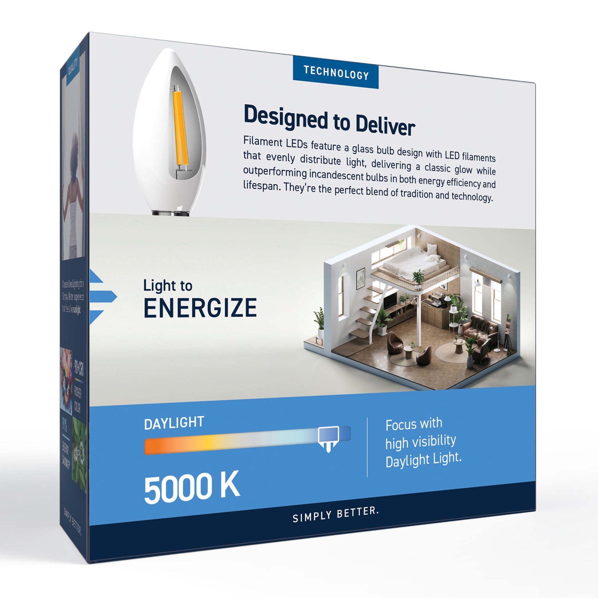 Upgrade your lighting game with our Chandelier Daylight LED Bulb, designed to deliver bright, energizing efficiency with effortless style. Emitting a crisp white Daylight light (5000K), this bulb creates an environment for focus and energy ideal in kitchens, offices, and anywhere you need to see the fine details. With a remarkable 90+ Color Rendering Index (CRI), colors appear more vivid and true-to-life, enhancing the beauty of your home’s décor and making everything look its best. Built to last with an impressive 20,000-hour lifespan, this energy-efficient LED saves you money and time, reducing replacements and energy costs compared to traditional 60W incandescent bulbs. This 500-lumen bulb has a Candelabra E12 base, and replacements are fewer and further between with eco-friendly, LED bulb technology. Its dimmable design lets you set the mood with a flick of your wall switch. Illuminate your world with a bulb that combines class, clarity, and reliability in one brilliant package.