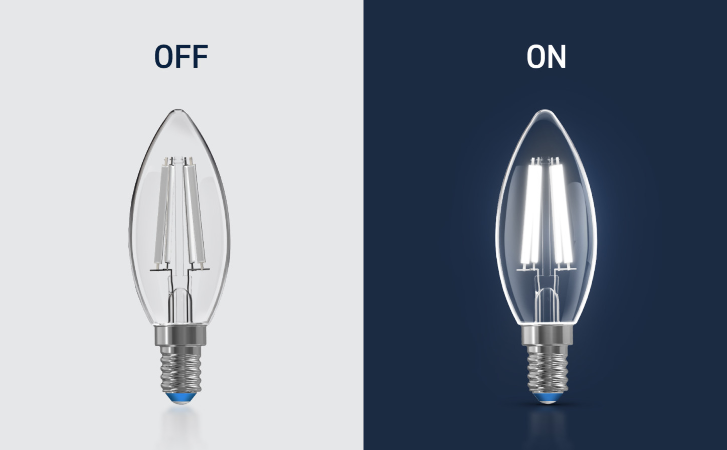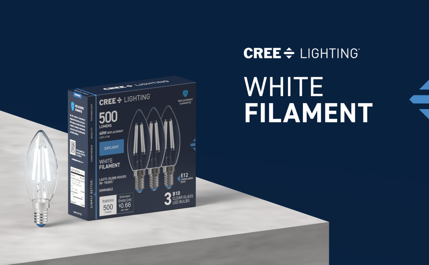 Refresh your lighting to fit your aesthetic with our White Filament LED Daylight bulb. Equipped with low-profile, white coated filament design, these clear bulbs give off stunning, stylish illumination while on and blend seamlessly into your decor while off. The candle shape brings a high-end ambiance to your fixtures. Boost visibility and stay on task with the vibrant clarity of Daylight Light (5000K). The remarkable 90+ Color Rendering Index (CRI) makes colors appear more vivid and true-to-life, enhancing the beauty of your home's decor and making everything look its best for up to 20,000 hours. This 500-lumen bulb has a Candelabra E12 base, and replacements are fewer and further between with eco-friendly, LED bulb technology. This bulb does with 5.5W what a traditional incandescent bulb does with 60W, making it 90.8% more efficient. Whether it's in your living room, home office, or kitchen, enjoy flicker-free, sustainable lighting that elevates your fixtures with effortlessly sleek style.