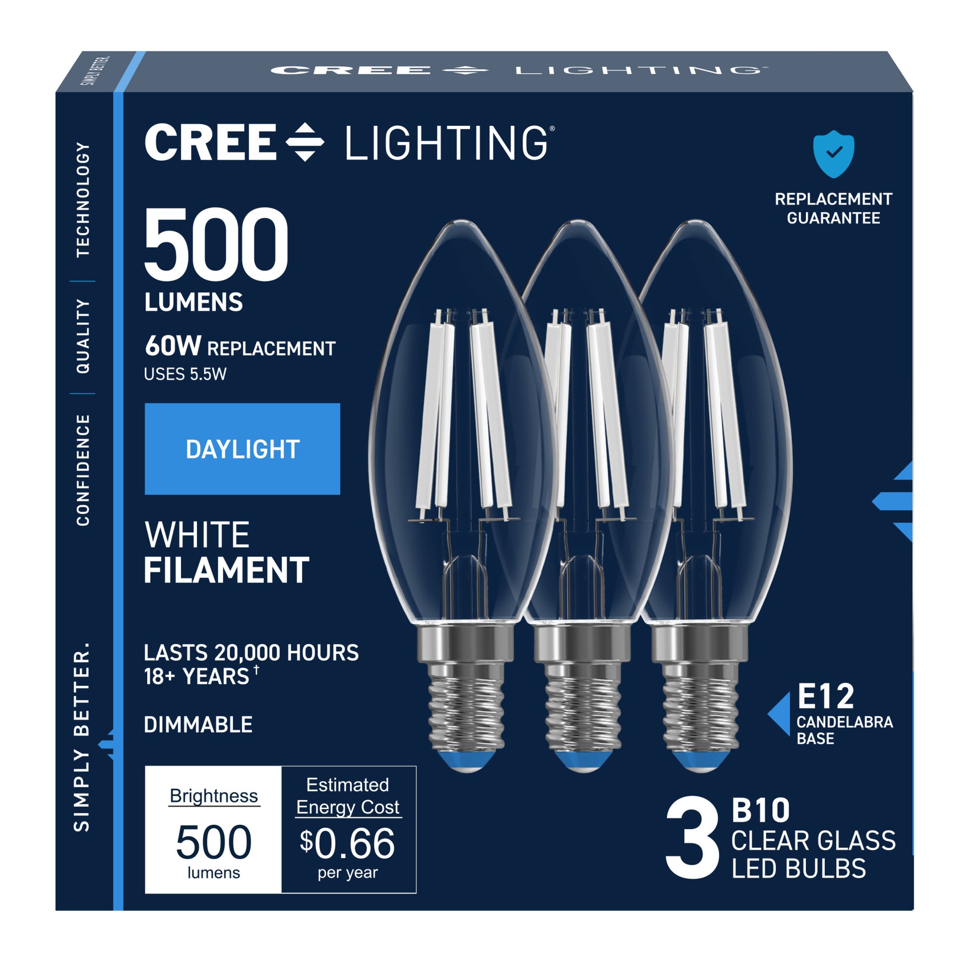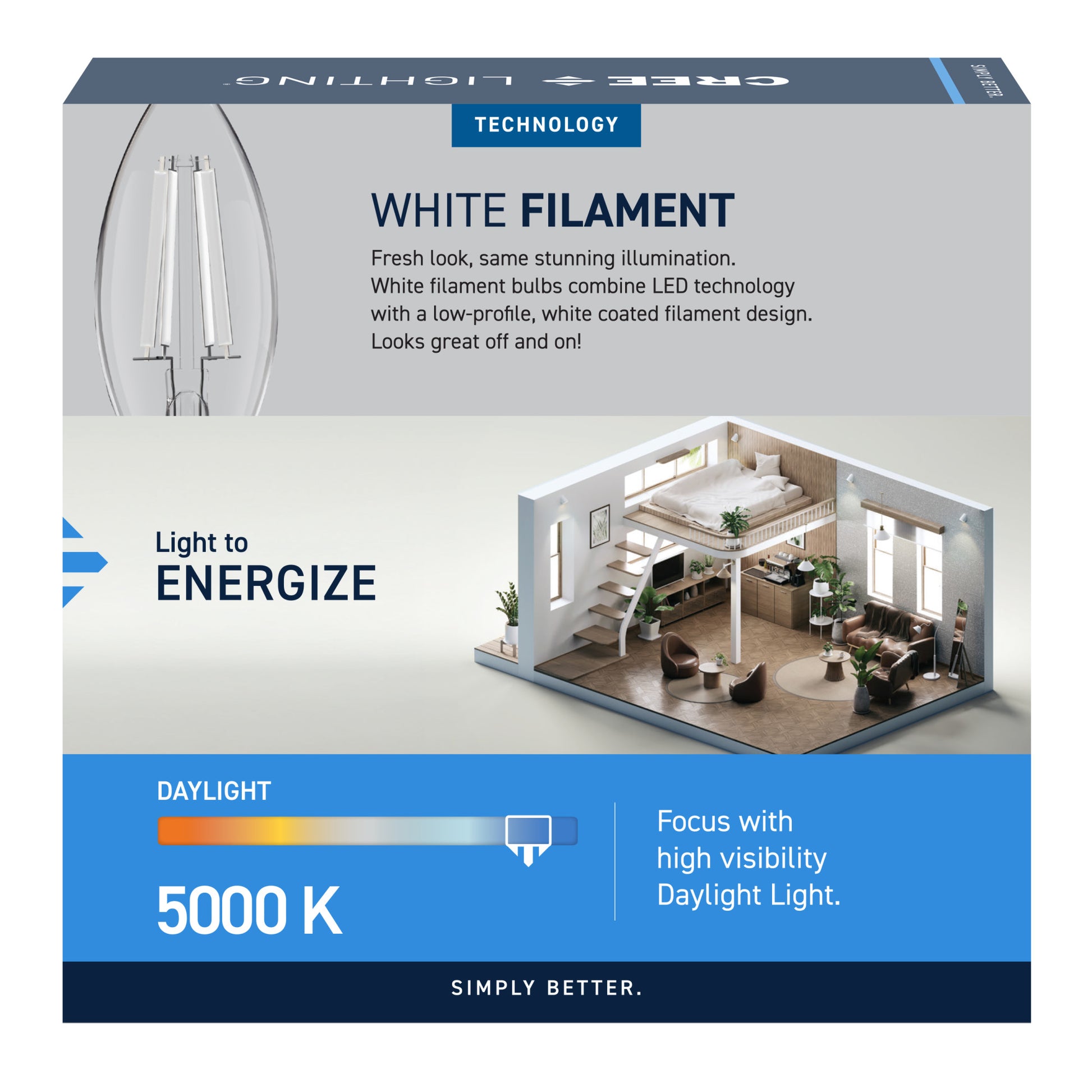 Refresh your lighting to fit your aesthetic with our White Filament LED Daylight bulb. Equipped with low-profile, white coated filament design, these clear bulbs give off stunning, stylish illumination while on and blend seamlessly into your decor while off. The candle shape brings a high-end ambiance to your fixtures. Boost visibility and stay on task with the vibrant clarity of Daylight Light (5000K). The remarkable 90+ Color Rendering Index (CRI) makes colors appear more vivid and true-to-life, enhancing the beauty of your home’s decor and making everything look its best for up to 20,000 hours. This 500-lumen bulb has a Candelabra E12 base, and replacements are fewer and further between with eco-friendly, LED bulb technology. This bulb does with 5.5W what a traditional incandescent bulb does with 60W, making it 90.8% more efficient. Whether it’s in your living room, home office, or kitchen, enjoy flicker-free, sustainable lighting that elevates your fixtures with effortlessly sleek style.