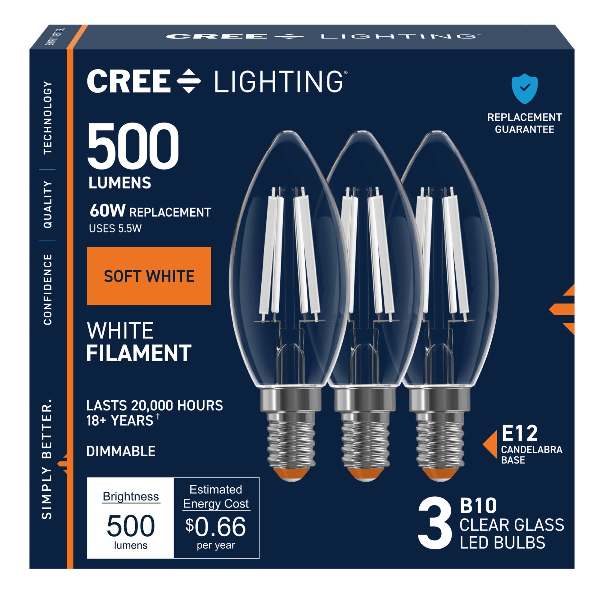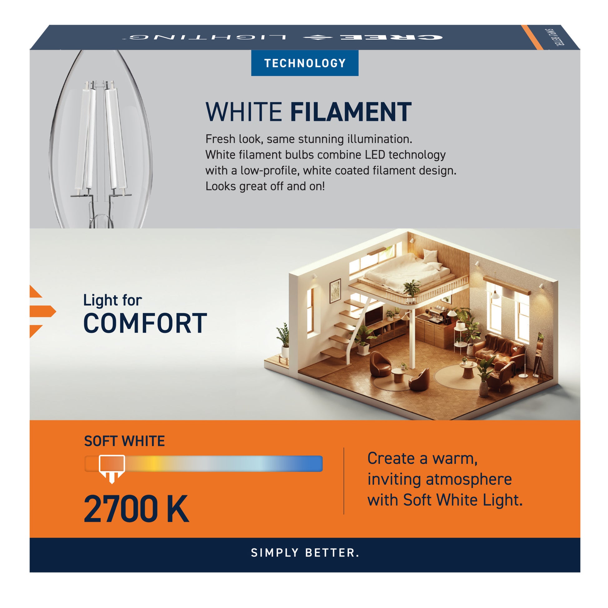 Refresh your lighting to fit your aesthetic with our White Filament LED Soft White bulb. Equipped with low-profile, white coated filament design, these clear bulbs give off stunning, stylish illumination while on and blend seamlessly into your decor while off. The candle shape brings a high-end ambiance to your fixtures. Create a warm, inviting atmosphere that makes any space feel like home with Soft White Light (2700K). The remarkable 90+ Color Rendering Index (CRI) makes colors appear more vivid and true-to-life, enhancing the beauty of your home’s decor and making everything look its best for up to 20,000 hours. This 500-lumen bulb has a Candelabra E12 base, and replacements are fewer and further between with eco-friendly, LED bulb technology. This bulb does with 5.5W what a traditional incandescent bulb does with 60W, making it 90.8% more efficient. Whether it’s in your living room, bedroom, or reading nook, enjoy flicker-free, sustainable lighting that elevates your fixtures with effortlessly sleek style.