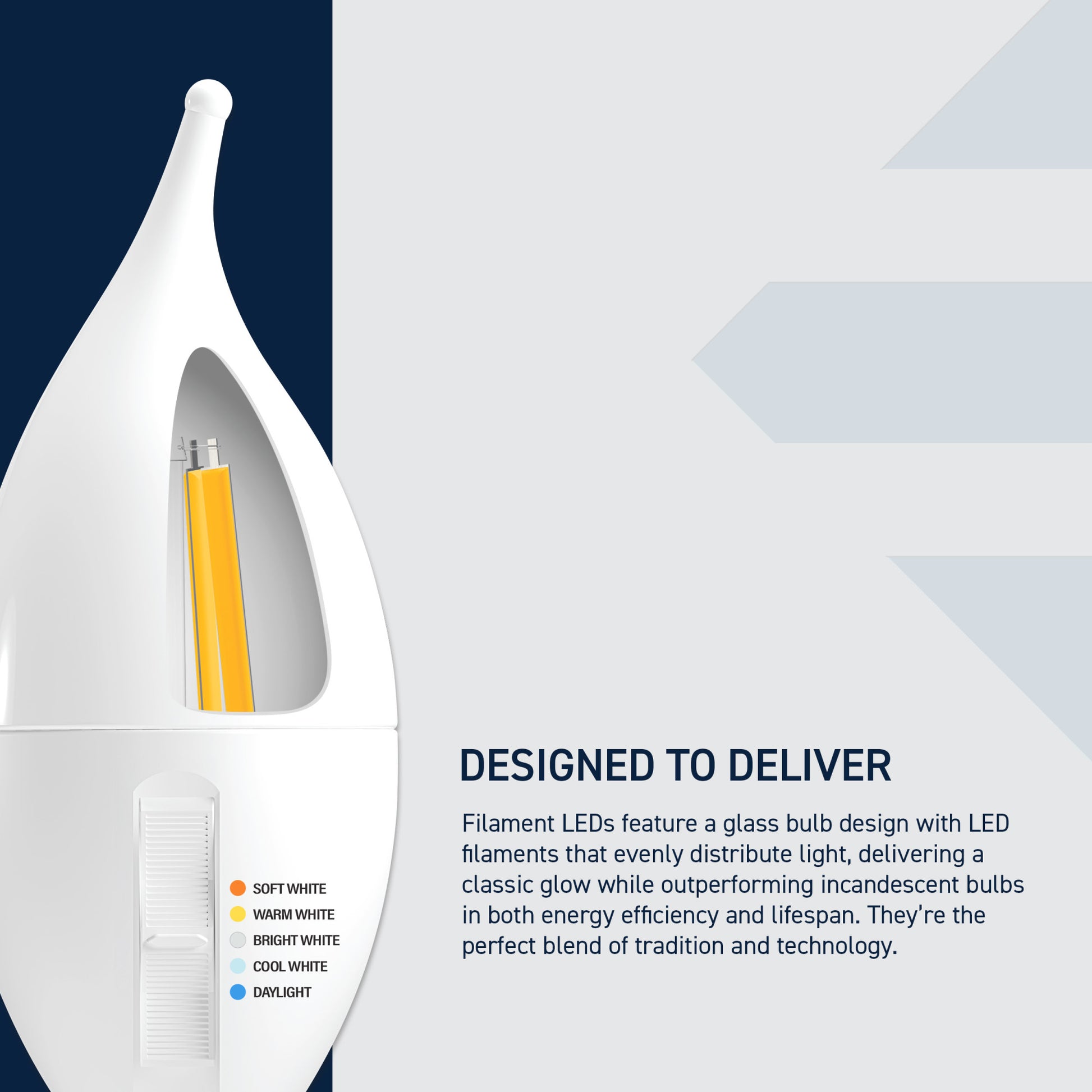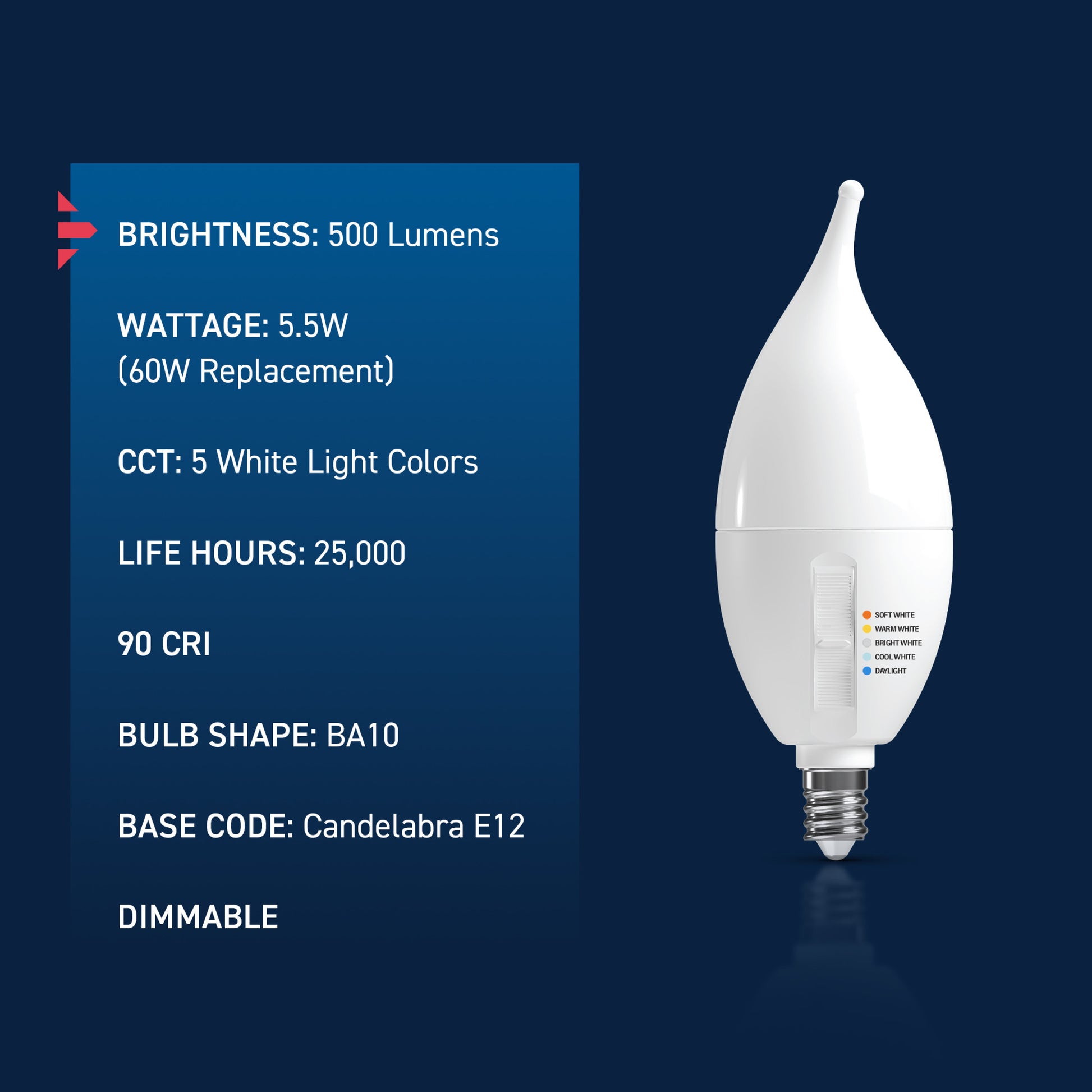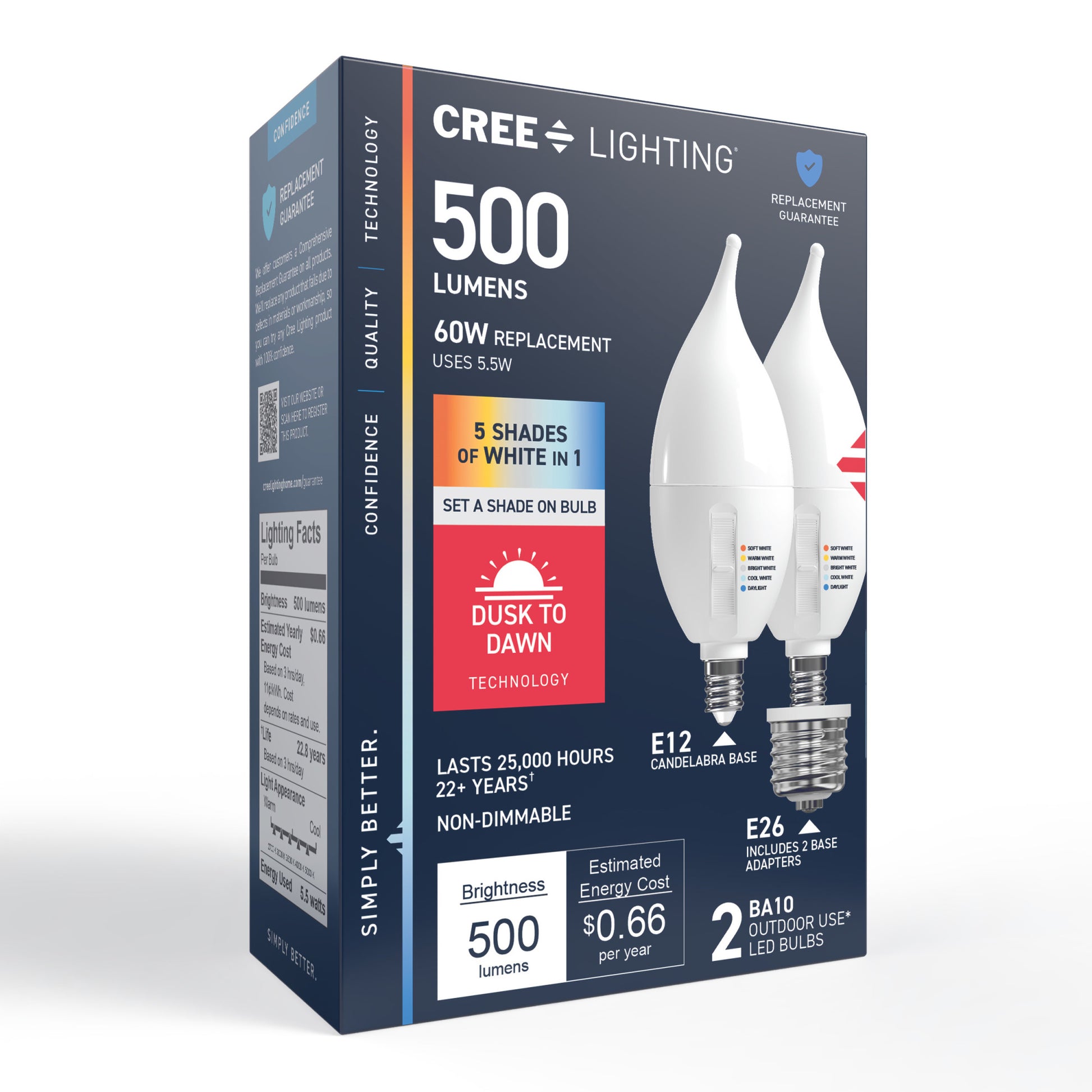Upgrade your lighting game with our LED Dusk to Dawn Chandelier Switchable White bulb. Automated sensors turn the bulb on at dusk and off at dawn for effortless illumination. The candle shape brings a high-end ambiance to your visible fixtures. Toggle between Soft White (2700K), Warm White (3000K), Bright White (3500K), Cool White (4000K), and Daylight (5000K) to suit any space, whether you’re going for cozy and inviting, bright and energizing, or matching other lighting in the space. The remarkable 90+ Color Rendering Index (CRI) makes colors appear more vivid and true-to-life, enhancing the beauty of your home’s decor and making everything look its best for up to 25,000 hours. Low Blue technology reduces harsh blue light waves that can cause headaches and disruptions to circadian rhythm. This 500-lumen bulb has a Candelabra E12 base, making it an easy upgrade from traditional 60W incandescent bulbs. Replacements are fewer and further between with eco-friendly, LED bulb technology. Whether it’s on the front porch, the back patio, or serving as a night-light, enjoy flicker-free, sustainable lighting that elevates your fixtures with effortlessly sleek style.