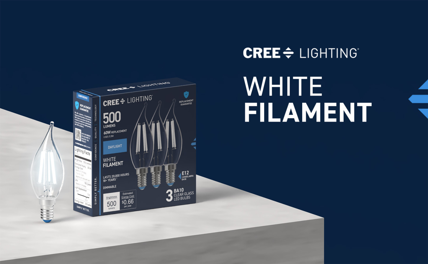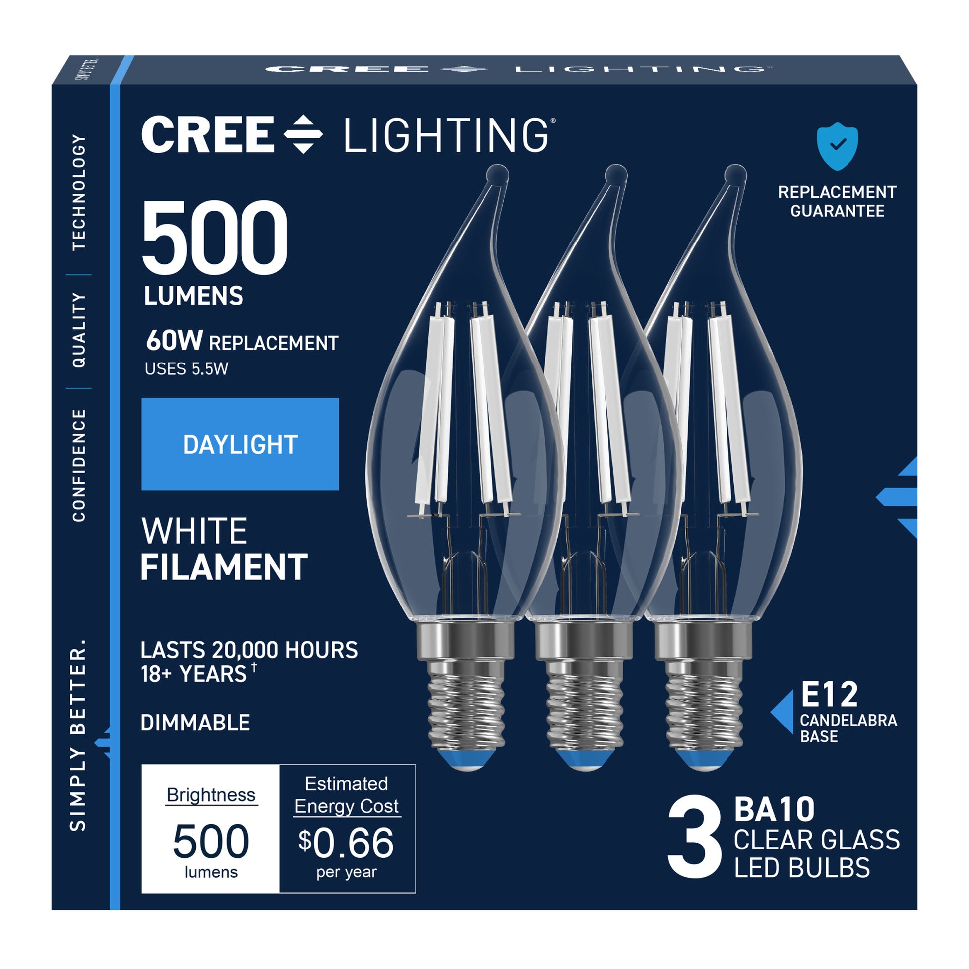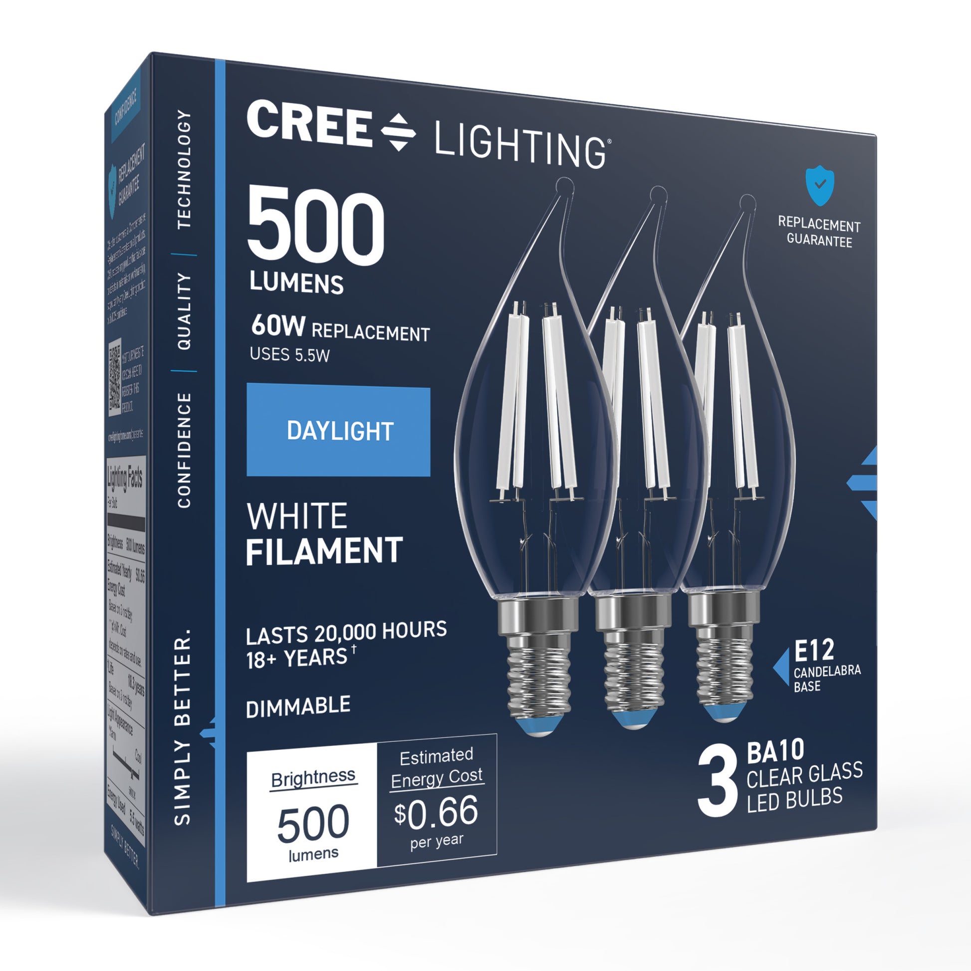 Refresh your lighting to fit your aesthetic with our White Filament LED Chandelier Daylight bulb. Equipped with low-profile, white coated filament design, these clear glass bulbs give off stunning, stylish illumination while on and blend seamlessly into your decor while off. The candle shape brings a high-end ambiance to your fixtures. Boost visibility and stay on task with the vibrant clarity of Daylight Light (5000K). The remarkable 90+ Color Rendering Index (CRI) makes colors appear more vivid and true-to-life, enhancing the beauty of your home's decor and makes everything look its best for up to 20,000 hours. This 500-lumen bulb has a Candelabra E12 base, and replacements are fewer and further between with eco-friendly, LED bulb technology. This bulb does with 5.5W what a traditional incandescent bulb does with 60W, making it 90.8% more efficient. Whether it's in your living room, home office, or kitchen, enjoy flicker-free, sustainable lighting that elevates your fixtures with effortlessly sleek style.