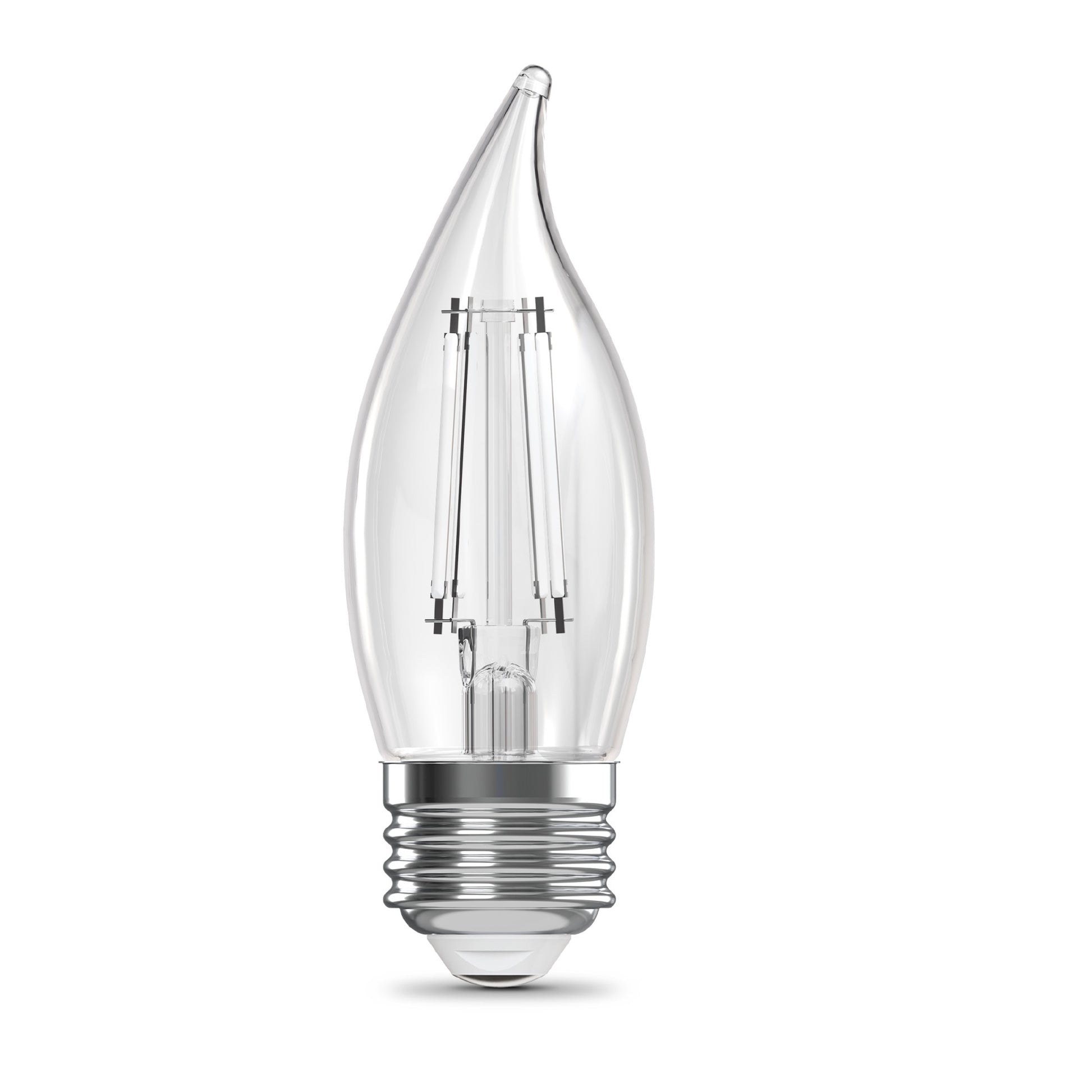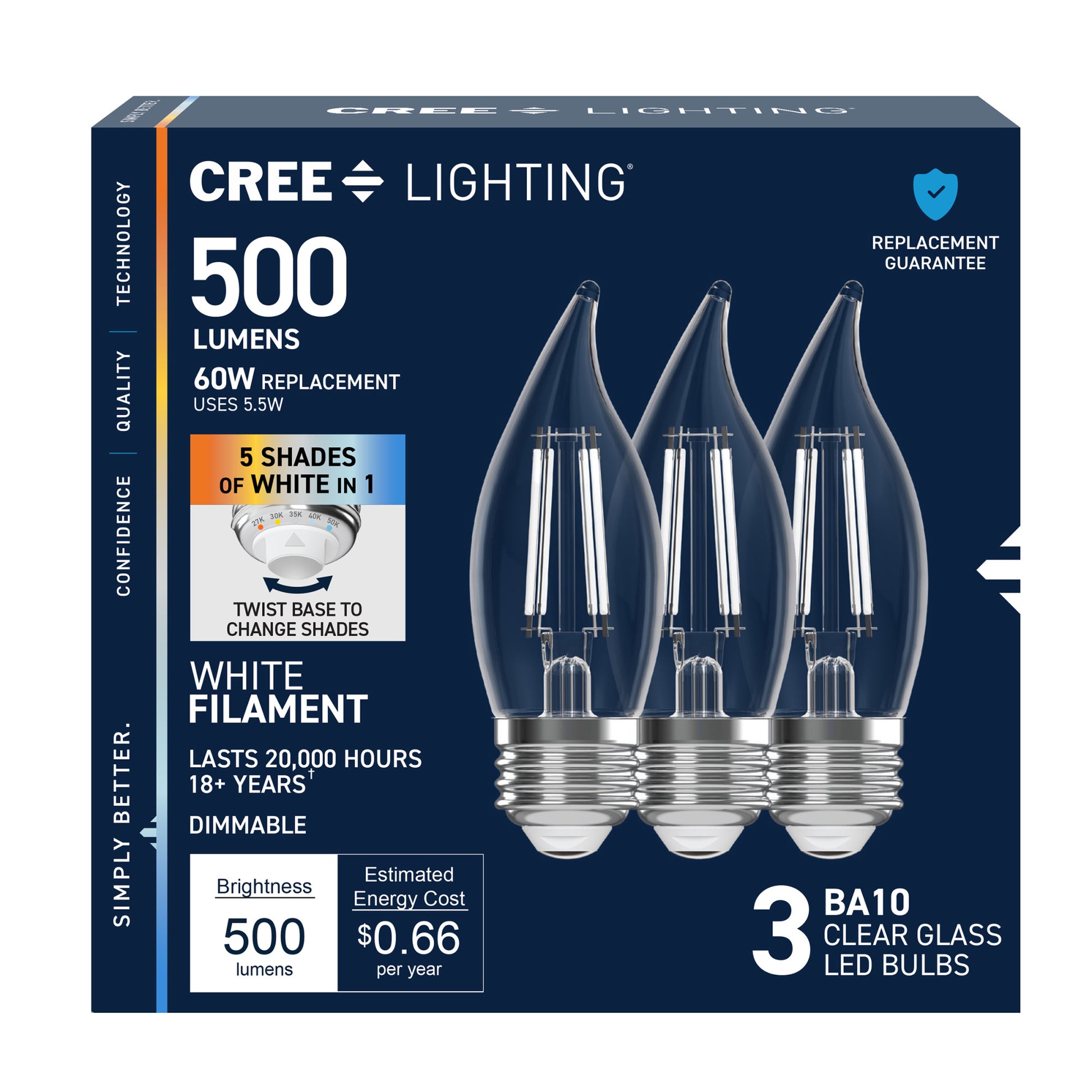 Refresh your lighting to fit your aesthetic with our White Filament LED Chandelier Switchable White bulb. Equipped with low-profile, white coated filament design, these clear bulbs give off stunning, stylish illumination while on and blend seamlessly into your decor while off. The candle shape brings a high-end ambiance to your fixtures. Toggle between Soft White (2700K), Warm White (3000K), Bright White (3500K), Cool White (4000K), and Daylight (5000K) to suit any room, whether you’re going for cozy and inviting, bright and energizing, or matching other lighting in the room. The remarkable 90+ Color Rendering Index (CRI) makes colors appear more vivid and true-to-life, enhancing the beauty of your home’s decor and making everything look its best for up to 20,000 hours. This 500-lumen bulb has a medium-size E26 base, making it an easy upgrade from traditional 60W incandescent bulbs in almost any fixture. Replacements are fewer and further between with eco-friendly, LED bulb technology. Whether it’s in your living room, bedroom, or dining room, enjoy flicker-free, sustainable lighting that elevates your fixtures with effortlessly sleek style.