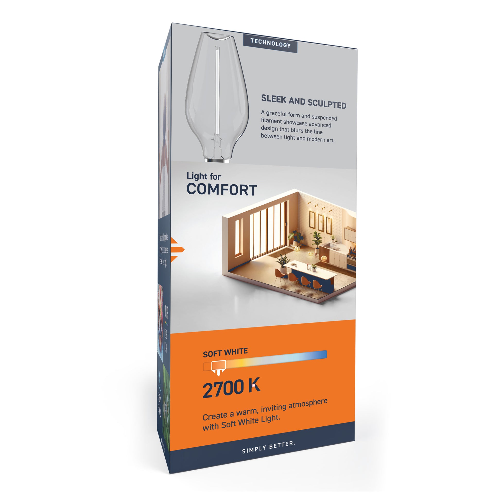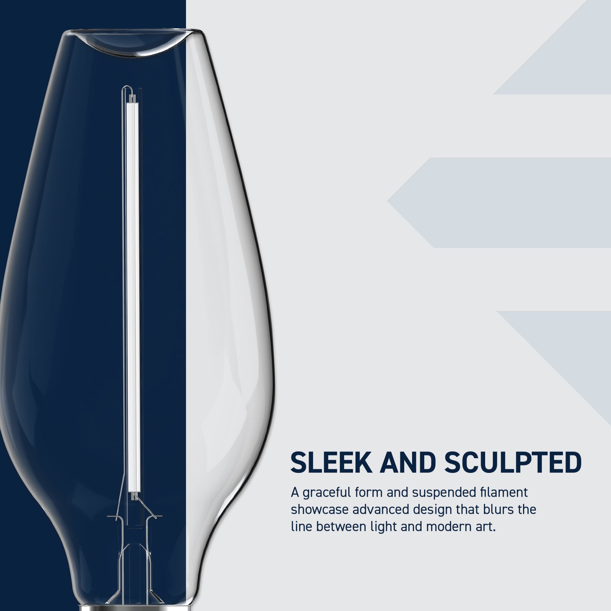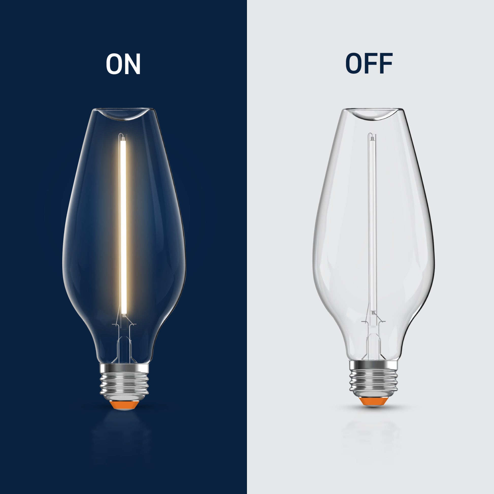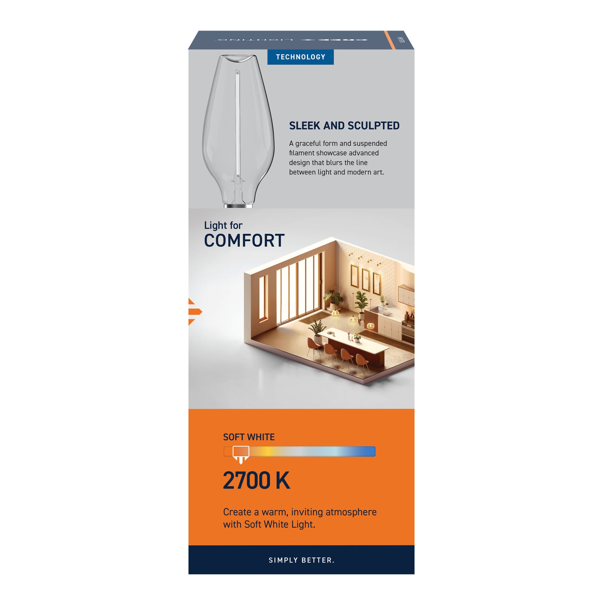 Upgrade your lighting game with Cree Lighting’s specialty White Filament Bottle Bulb, perfect for adding a chic touch of creativity to any room. Equipped with low-profile, white coated filament design, these clear bulbs give off stunning, stylish illumination while on and blend seamlessly into your decor while off. A graceful form and suspended filament showcase advanced design that blurs the line between light and modern art. With a medium E26 base, this bulb is an easy upgrade for most fixtures so they can become the centerpiece of the space. Soft White light (2700K) creates a warm, inviting atmosphere that makes any space feel like home, and a remarkable 90+ Color Rendering Index makes colors appear more vivid and true-to-life, enhancing the beauty of your home’s decor and making everything look its best. Built to last with an impressive 20,000-hour lifespan, this energy-efficient LED saves you money and time, reducing replacements and energy costs compared to traditional 60W incandescent bulbs. Whether it’s in the dining room, bedroom, or reading nook, enjoy flicker-free, eco-friendly lighting that’s mercury-free and designed for sustainability. Illuminate your world with a bulb that combines comfort, clarity, and reliability – all in one brilliant package.