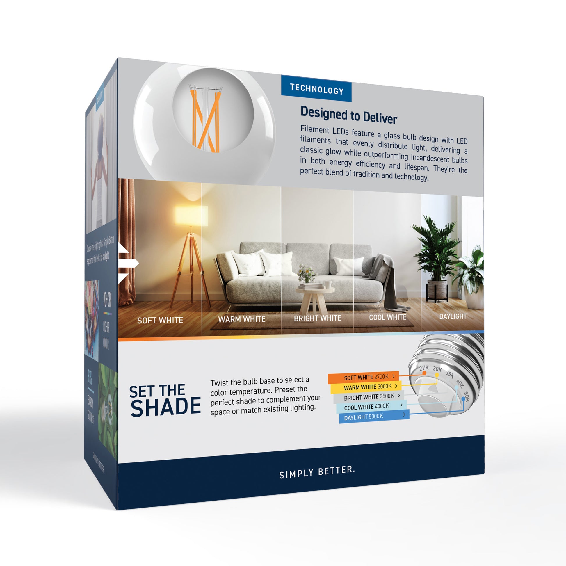 - Choose between Soft White (2700K), Warm White (3000K), Bright White (3500K), Cool White (4000K), and Daylight (5000K)
