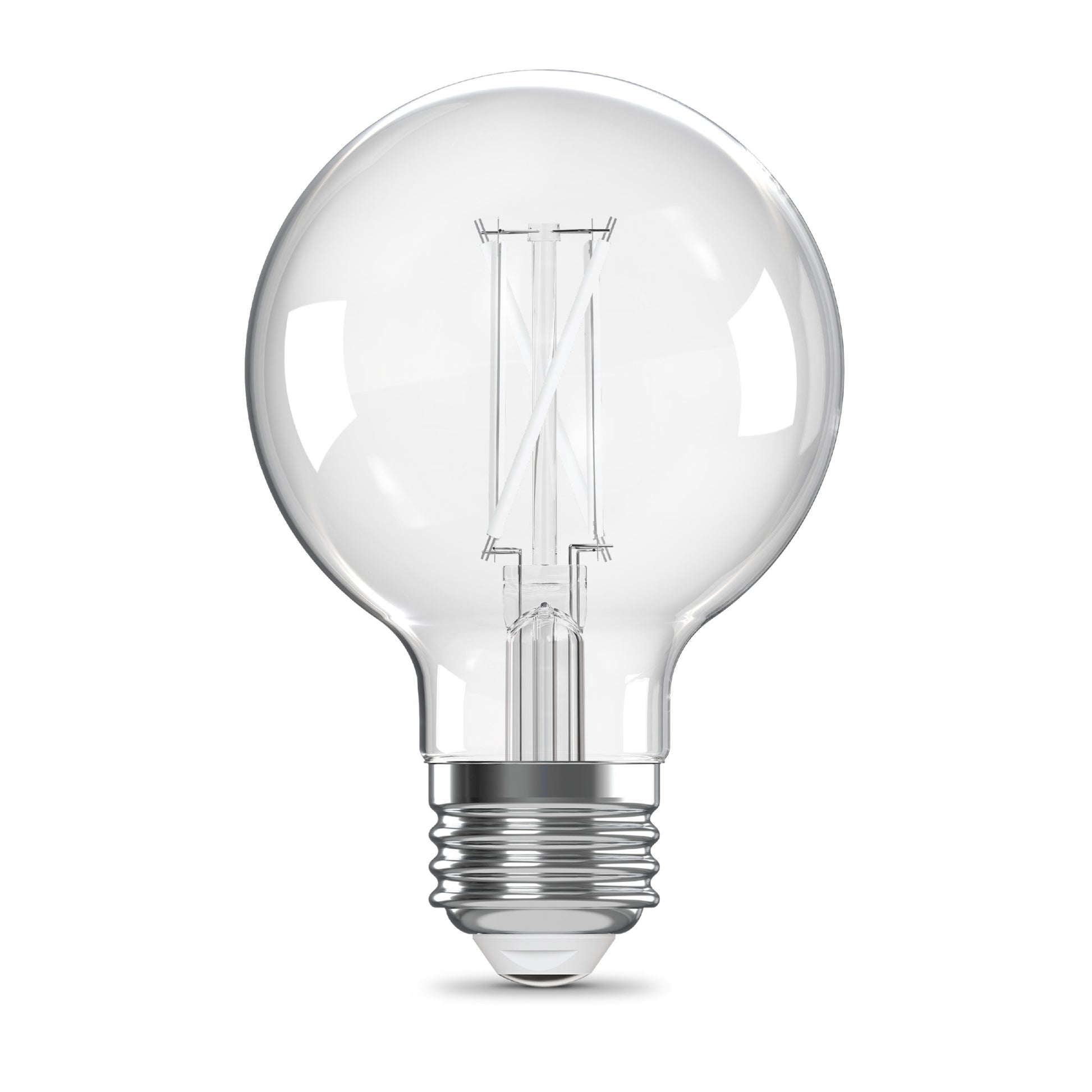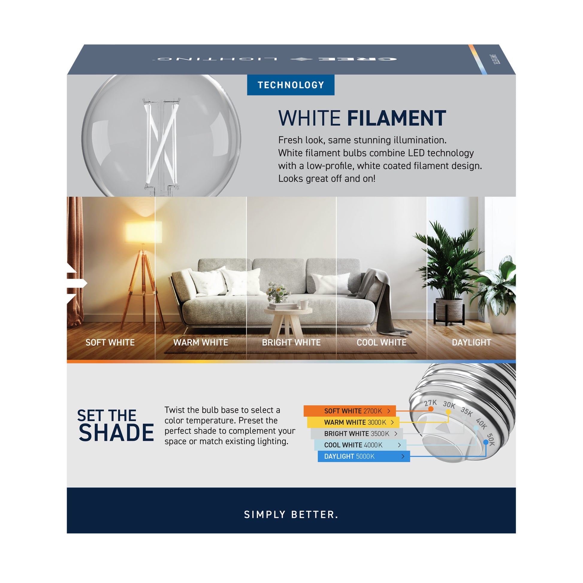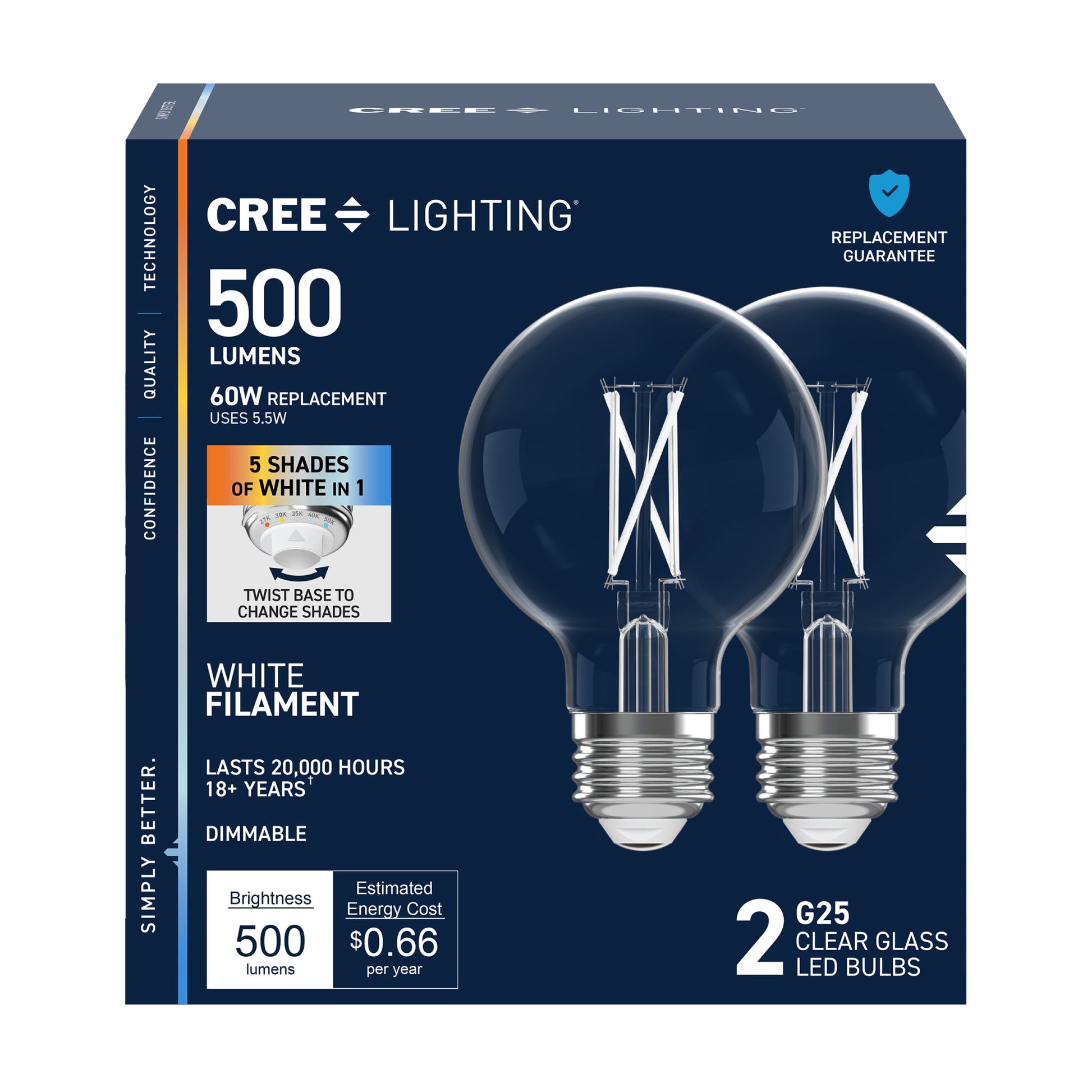 Upgrade your exposed lighting fixtures with the Cree Lighting G25 Switchable White light bulb, designed to deliver quality, efficiency, and style in any room. Its stunning globe shape is ideal for decorative fixtures like hanging pendants and bathroom vanities. Equipped with low-profile, white coated filament design, these clear bulbs give off stunning, stylish illumination while on and blend seamlessly into your decor while off. Toggle between Soft White (2700K), Warm White (3000K), Bright White (3500K), Cool White (4000K), and Daylight (5000K) to suit any room, whether you’re going for cozy and inviting, bright and energizing, or matching other lighting in the room. With a remarkable 90+ Color Rendering Index (CRI), colors appear more vivid and true-to-life, enhancing the beauty of your home’s decor and making everything look its best. Built to last with an impressive 20,000-hour lifespan, this energy-efficient LED saves time and money, reducing replacements and energy costs when compared to traditional 60W incandescent bulbs. With a medium E26 base for easy upgrades in almost any fixture, this bulb is suitable for indoor and outdoor enclosed fixtures and is fully dimmable. Illuminate your world with a bulb that’s mercury-free, sustainable, and effortlessly chic.