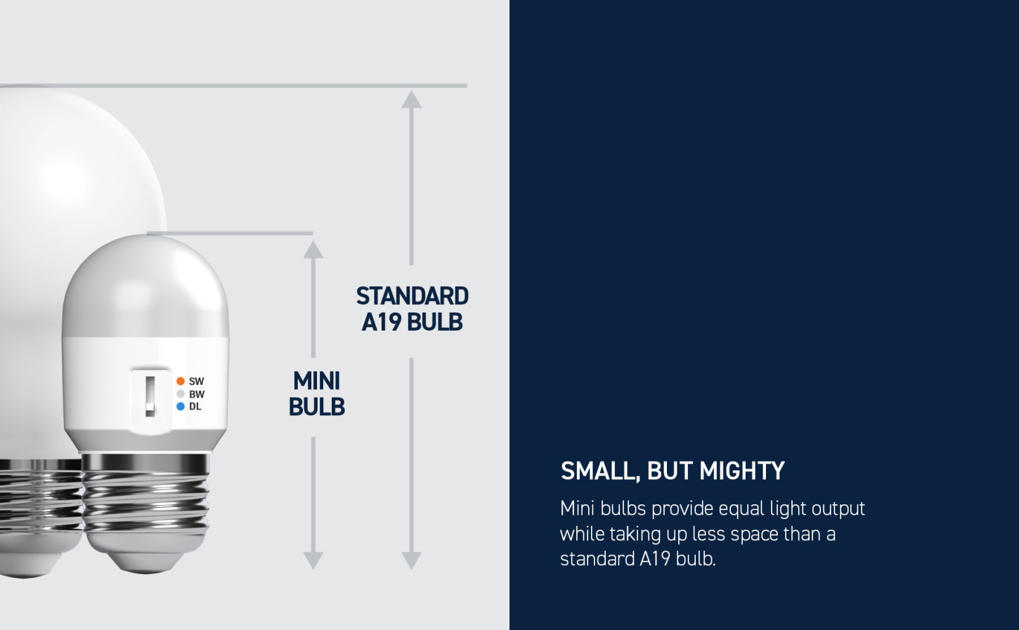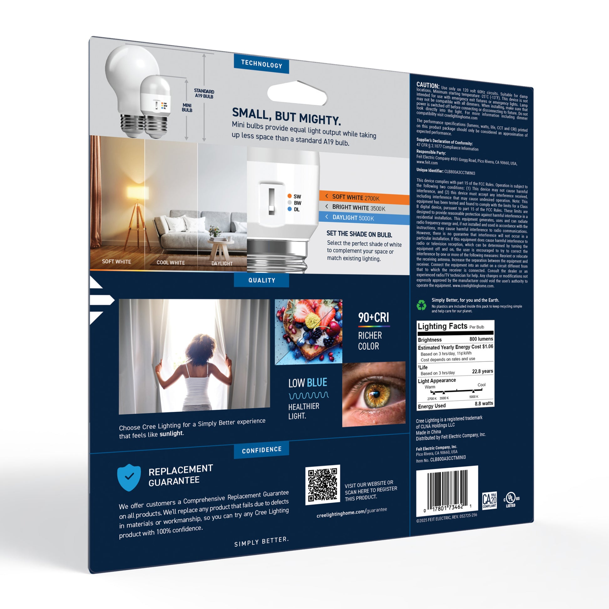 Upgrade your lighting game with our Switchable White LED Mini Bulbs, designed to pack a punch in a compact form. Choose between Soft White (2700K), Bright White (3500K), and Daylight (5000K) for a tone to fit any room in the house. Low Blue technology filters out harsh blue light that can cause eye strain, headaches, and disrupt sleep. With a remarkable 90+ Color Rendering Index (CRI), colors appear more vivid and true-to-life, enhancing the beauty of your home’s décor and making everything look its best. Built to last with an impressive 25,000-hour lifespan, this energy-efficient LED saves you money and time, reducing replacements and energy costs compared to a traditional 60W incandescent bulb. With a medium-sized E26 base, this dimmable bulb provides an easy upgrade in most fixtures. Whether it’s your living room, bedroom, or kitchen, enjoy flicker-free, eco-friendly lighting that’s mercury-free and designed for sustainability. Illuminate your world with a bulb that combines comfort, clarity, and reliability—all in one brilliant package.