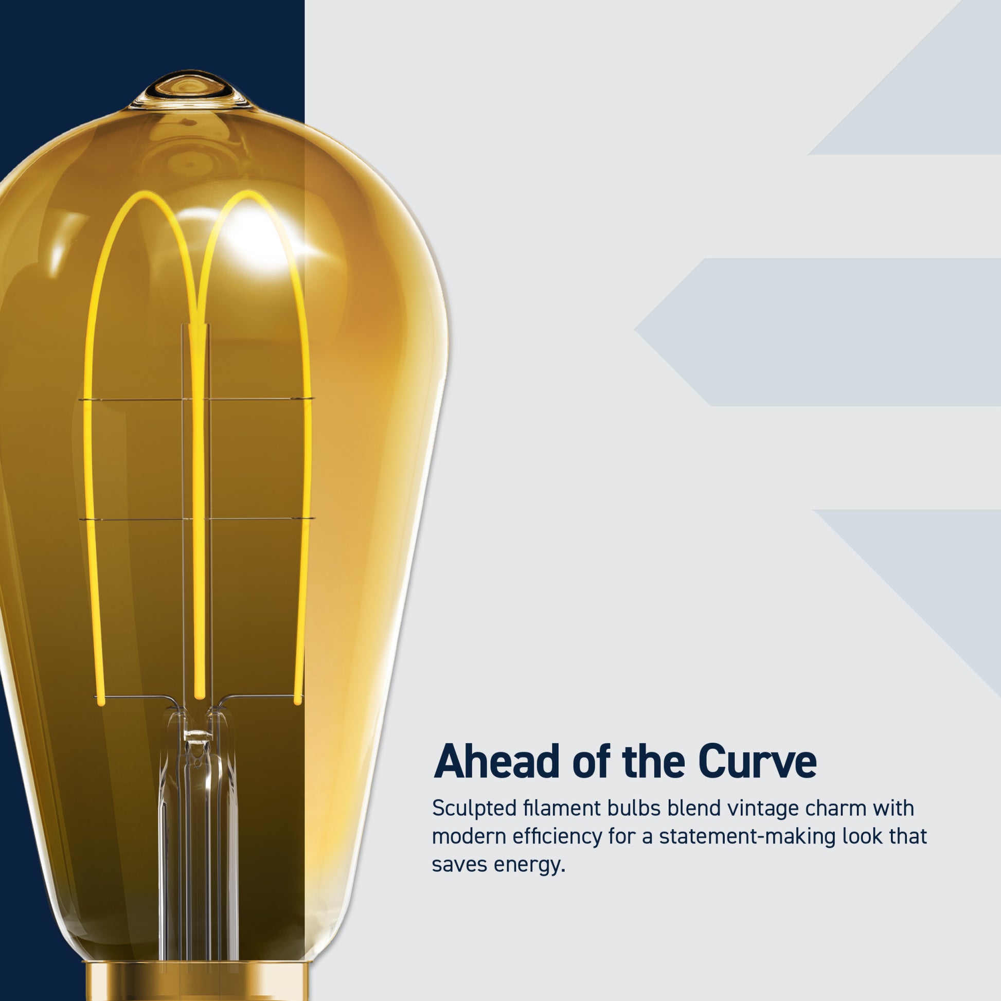 Upgrade your lighting game with our Vintage Flexible Filament Warm Light LED Bulb, designed to deliver a calm, inviting glow with old-school style. This glass bulb is made with a yellow filament and an amber finish to deliver an elegant antique look and feel. Emitting a Warm Light (2100K), this bulb creates a relaxing and cozy ambiance perfect for quiet nights in, intimate dinners and gatherings, and any space where comfort is key. Innovative LED technology and flexible filaments provide a lighting experience for those that want an eco-friendly, sustainable light in a classic look. Built to last with an impressive 20,000-hour lifespan, this energy-efficient LED saves you money and time, reducing replacements and energy costs when compared to 60W incandescent bulbs. Featuring a medium E26 base, it’s compatible with most fixtures, making upgrades effortless. Whether it’s in your bathroom spa, bedroom, or out on the patio, enjoy flicker-free, dimmable lighting that’s mercury-free and designed to last. Illuminate your world with a bulb that combines comfort, clarity, and reliability, all in one brilliant package.