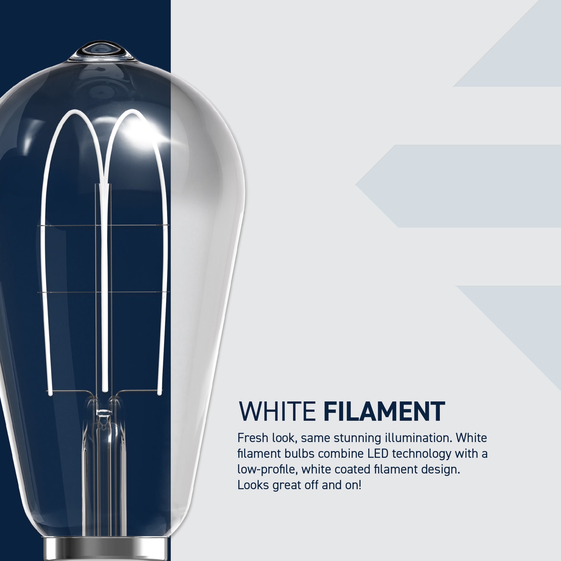 Refresh your lighting to fit your aesthetic with our White Filament LED ST19 Soft White bulb. Equipped with low-profile, white coated filament design, these clear glass bulbs give off stunning illumination while on and blend seamlessly into your decor while off. The Soft White (2700K) tone creates a warm, inviting atmosphere that makes any space feel like home for up to 20,000 hours. The remarkable 90+ Color Rendering Index (CRI) makes colors appear more vivid and true-to-life, enhancing the beauty of your home’s decor and making everything look its best. This 500-lumen bulb has a medium-size E26 base, making it an easy upgrade from traditional 60W incandescent bulbs in almost any fixture. Replacements are fewer and further between with eco-friendly, LED bulb technology. Whether it’s in your living room, bedroom, or reading nook, enjoy flicker-free, sustainable lighting that elevates your fixtures with effortlessly sleek style.