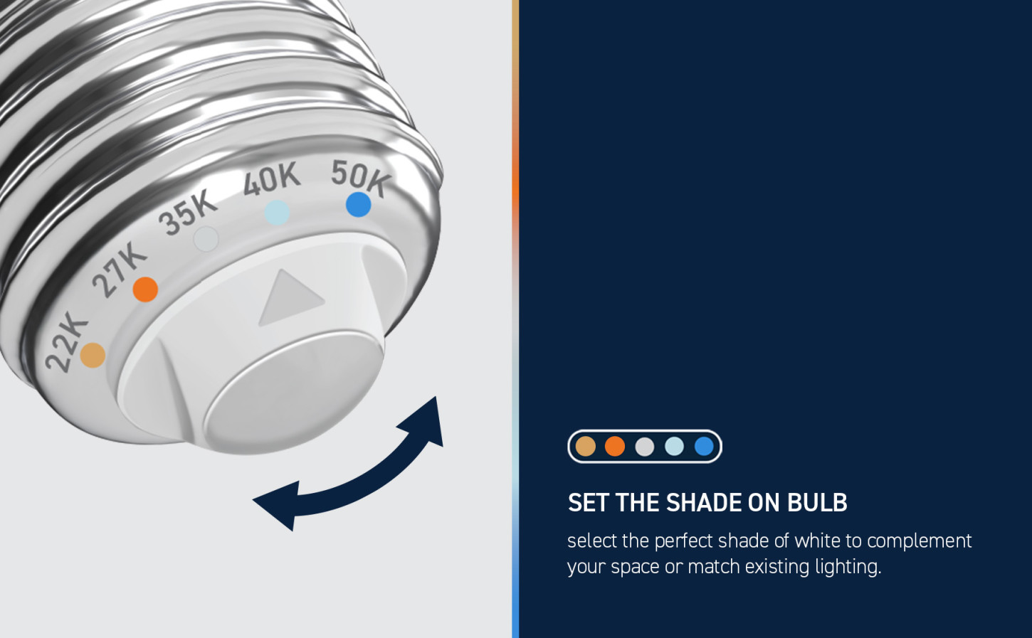 - Choose Warm Light (2200K), Soft White (2700K), Bright White (3500K), Cool White (4000K), or Daylight (5000K)