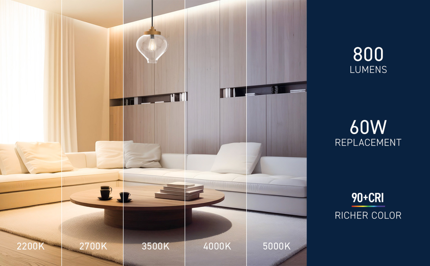 - Choose Warm Light (2200K), Soft White (2700K), Bright White (3500K), Cool White (4000K), or Daylight (5000K)