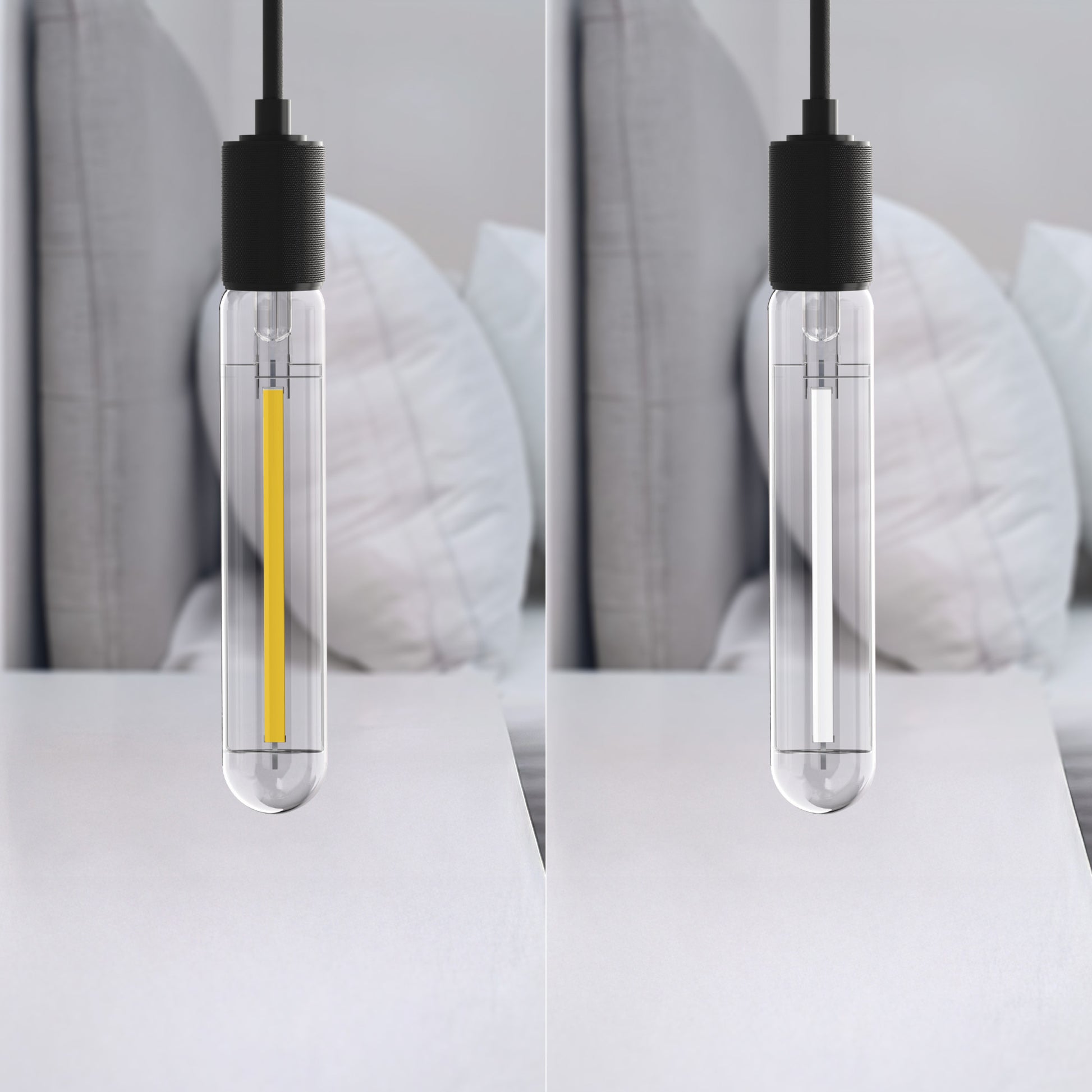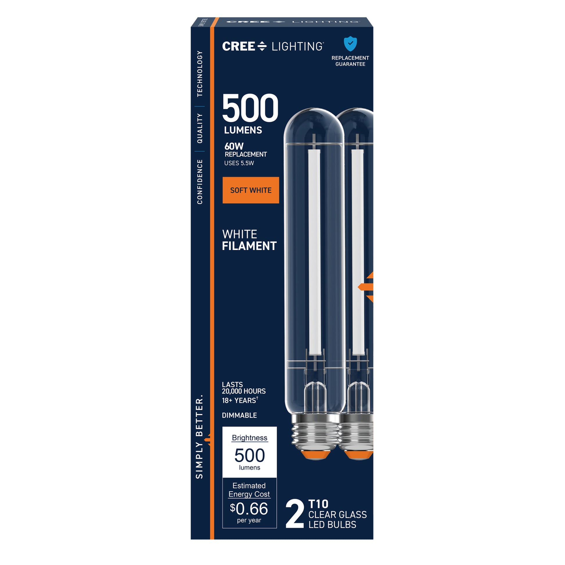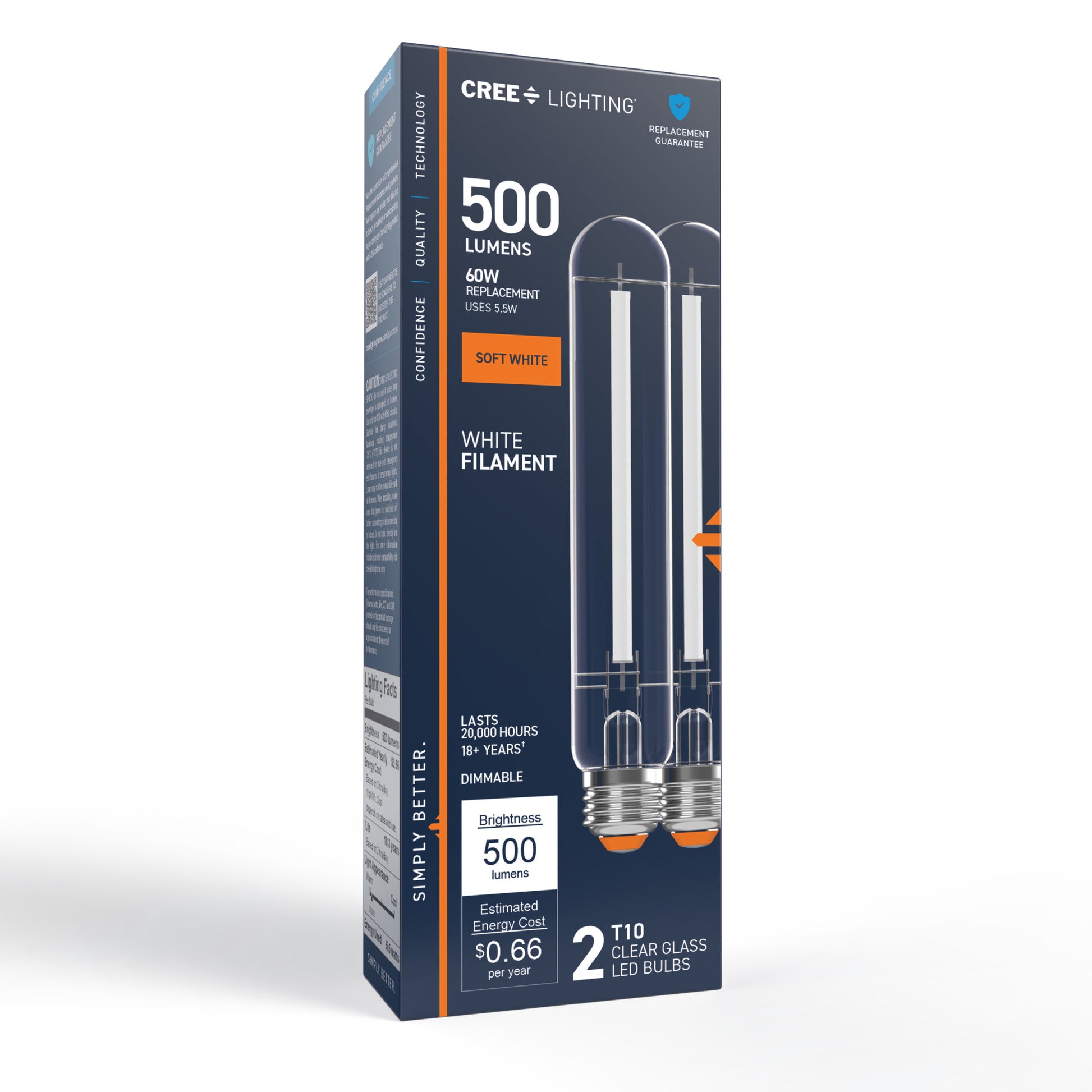 Upgrade your open lighting fixtures with the Cree Lighting T10 Soft White LED light bulb, designed to deliver quality, efficiency, and style in any room. Its clear tube shape is ideal for decorative fixtures like hanging pendants and wall sconces. Equipped with low-profile, white coated filament design, these clear bulbs give off stunning, stylish illumination while on and blend seamlessly into your decor while off. Create a warm, welcoming atmosphere that makes any space feel like home with Soft White (2700K) light. With a remarkable 90+ Color Rendering Index (CRI), colors appear more vivid and true-to-life, enhancing the beauty of your home's decor and making everything look its best. Built to last with an impressive 20,000-hour lifespan, this energy-efficient LED saves time and money, reducing replacements and energy costs when compared to traditional 60W incandescent bulbs. With a medium E26 base for easy upgrades in almost any fixture, this bulb is suitable for indoor and outdoor open fixtures and is fully dimmable. Illuminate your world with a bulb that's mercury-free, sustainable, and effortlessly chic.