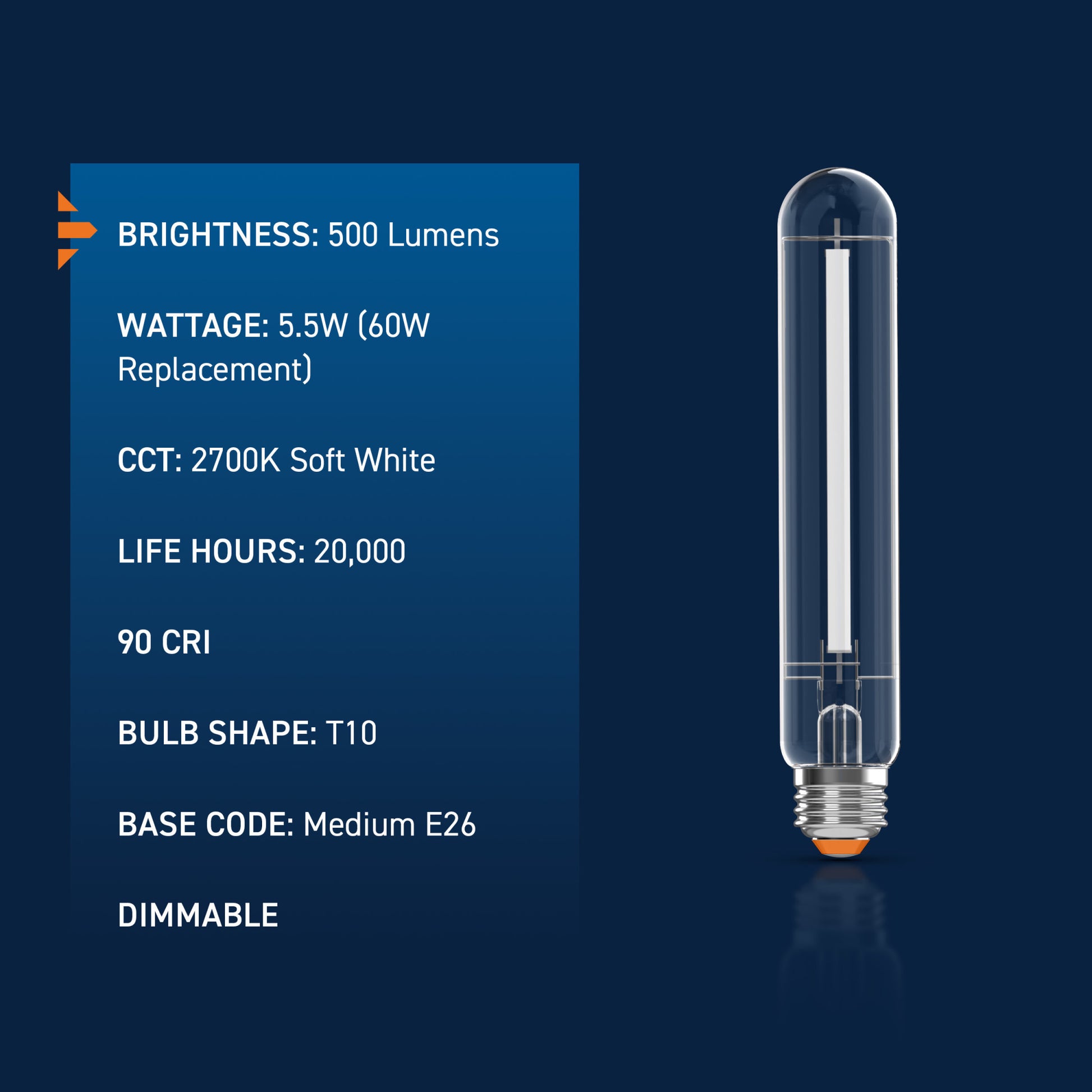 - 5.5W tube-shaped T10 Bulb is ideal for replacing 60W incandescent bulbs