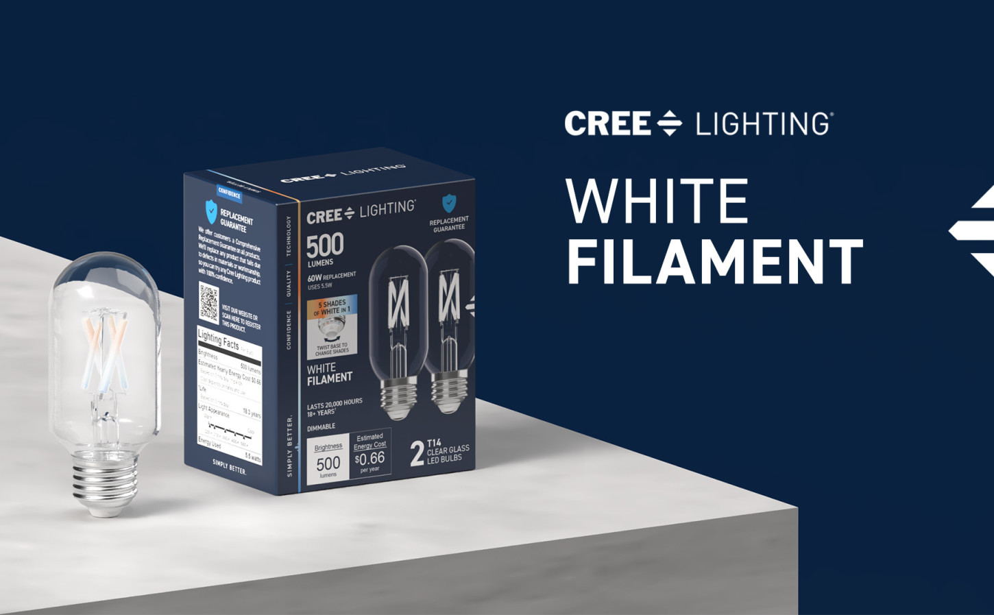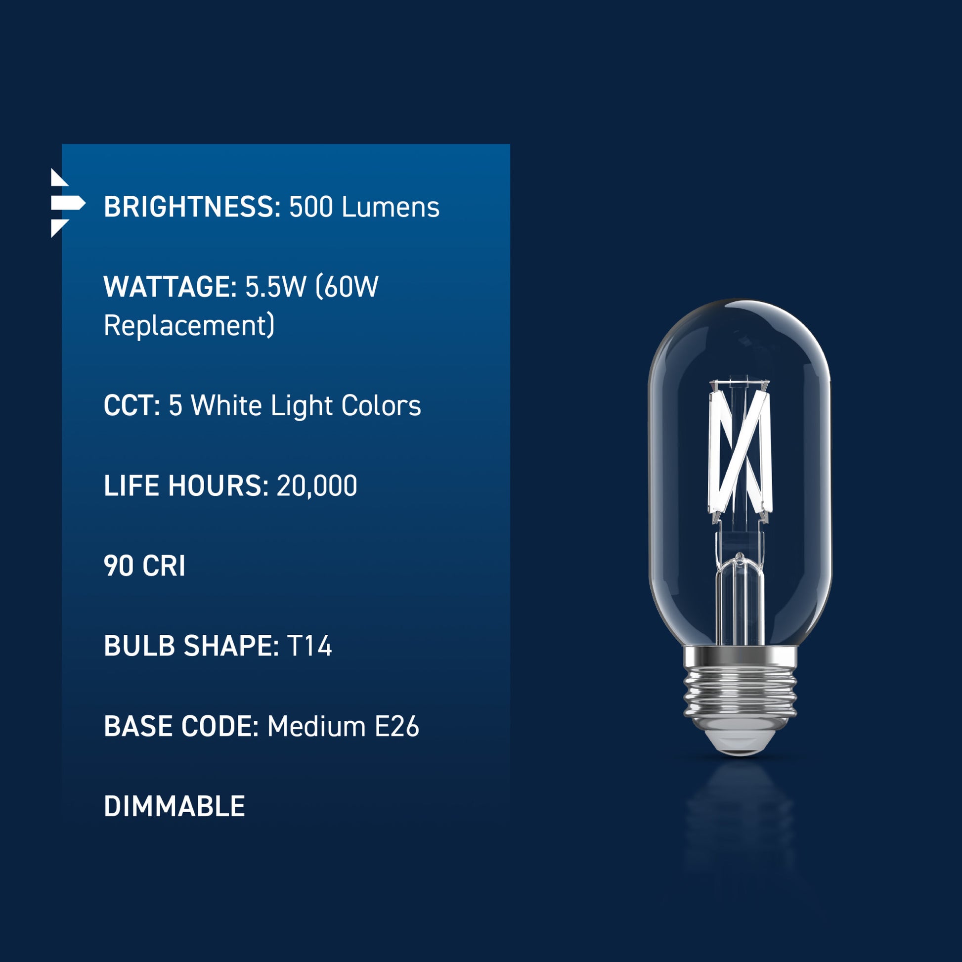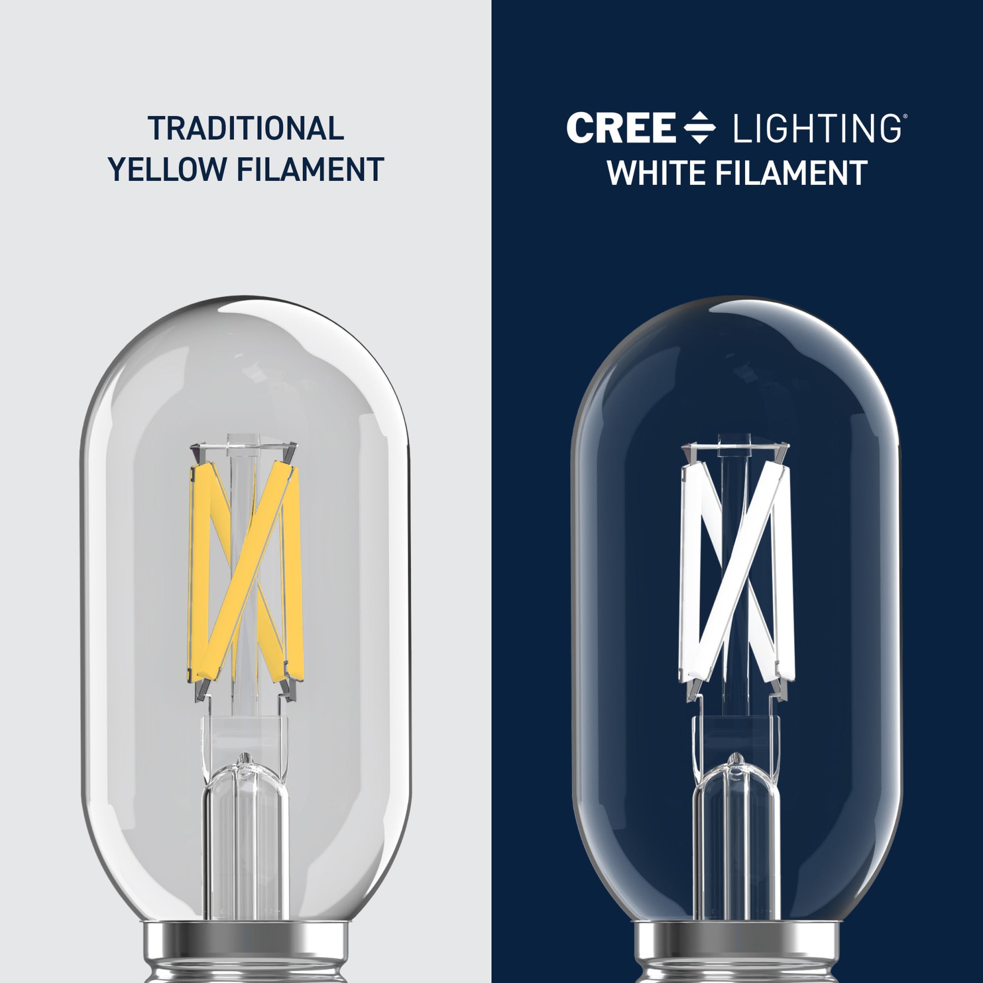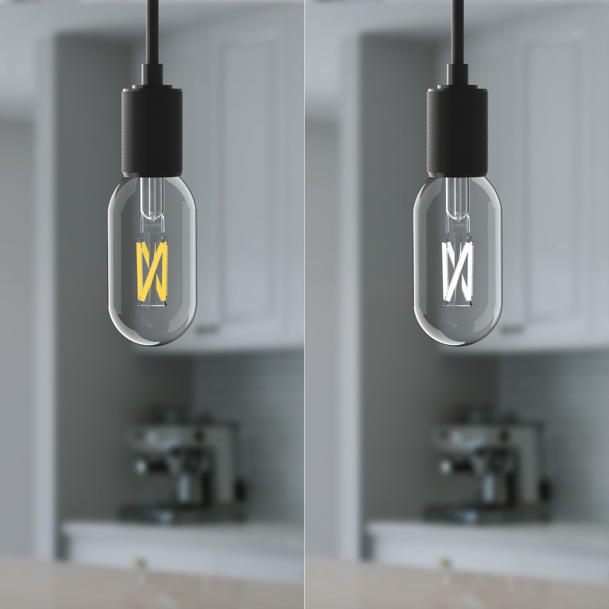 Upgrade your open lighting fixtures with the Cree T14 Switchable White LED light bulb, designed to deliver quality, efficiency, and style in any room. Its clear tube shape is ideal for decorative fixtures like hanging pendants and wall sconces. Equipped with low-profile, white coated filament design, these clear bulbs give off stunning, stylish illumination while on and blend seamlessly into your decor while off. Toggle between Warm Light (2200K), Soft White (2700K), Bright White (3500K), Cool White (4000K), and Daylight (5000K) to suit any room, whether you’re going for cozy and inviting, bright and energizing, or matching other lighting in the room. With a remarkable 90+ Color Rendering Index (CRI), colors appear more vivid and true-to-life, enhancing the beauty of your home’s decor and making everything look its best. Built to last with an impressive 20,000-hour lifespan, this energy-efficient LED saves time and money, reducing replacements and energy costs when compared to traditional 60W incandescent bulbs. With a medium E26 base for easy upgrades in almost any fixture, this bulb is suitable for indoor and outdoor fixtures and is fully dimmable. Illuminate your world with a bulb that’s mercury-free, sustainable, and effortlessly chic.