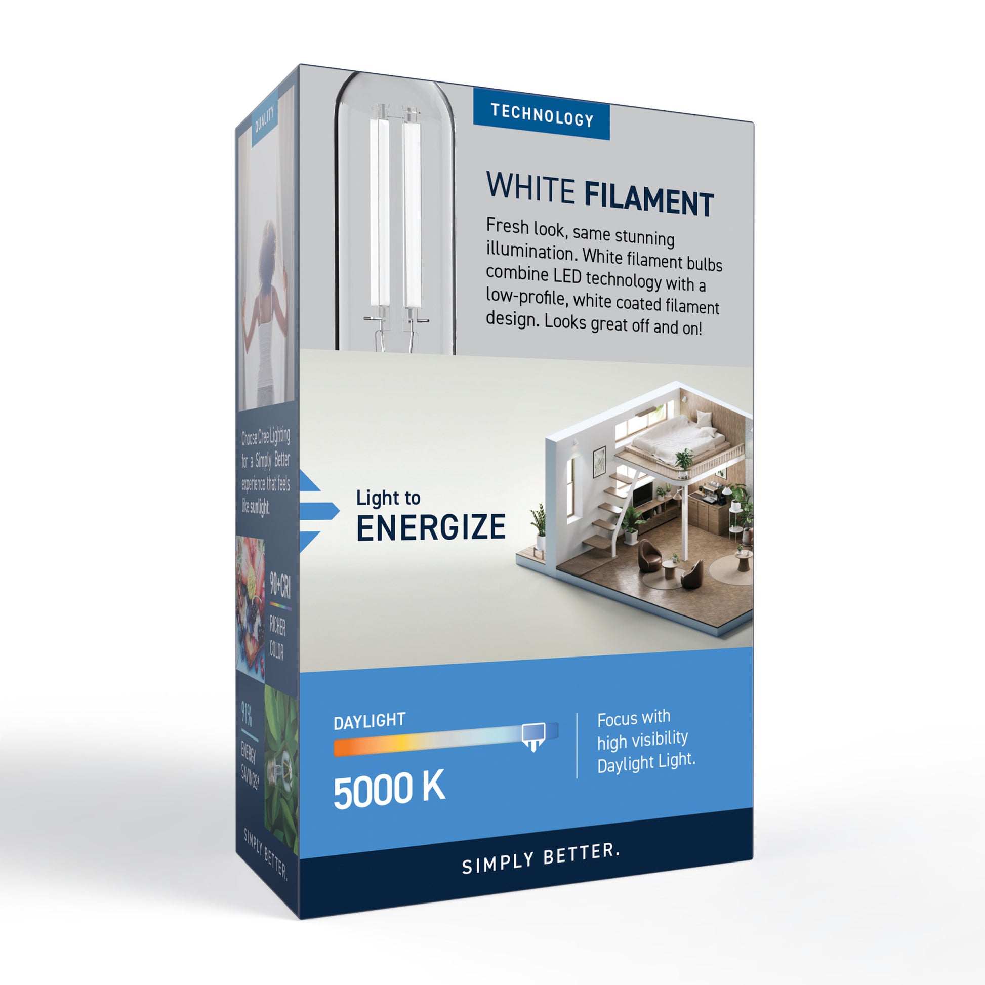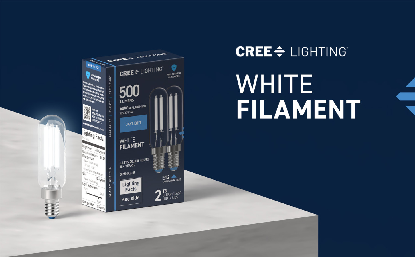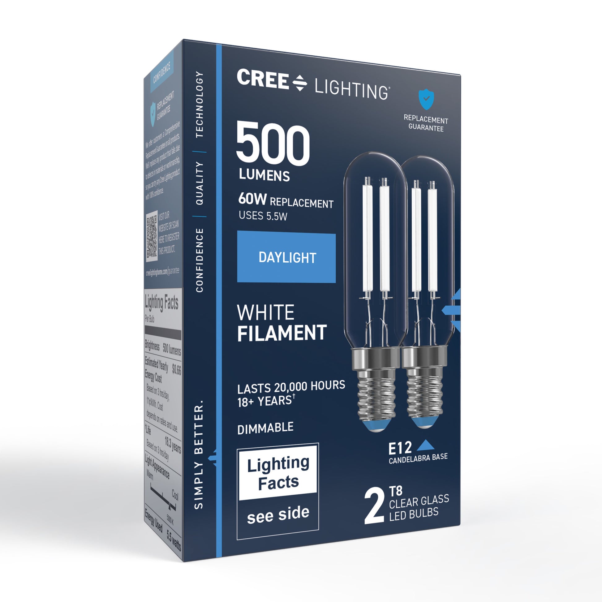 Upgrade your open lighting fixtures with the Cree Lighting T8 Daylight LED light bulb, designed to deliver quality, efficiency, and utility in any room. Its clear tube shape is ideal for decorative fixtures like hanging pendants and wall sconces. Equipped with low-profile, white coated filament design, these clear bulbs give off stunning, stylish illumination while on and blend seamlessly into your decor while off. Boost visibility and stay on task with the vibrant clarity of Daylight (5000K) light. With a remarkable 90+ Color Rendering Index (CRI), colors appear more vivid and true-to-life, enhancing the beauty of your home's decor and making everything look its best. Built to last with an impressive 20,000-hour lifespan, this energy-efficient LED saves time and money, reducing replacements and energy costs when compared to traditional 60W incandescent bulbs. With a Candelabra E12 base for easy upgrades, this bulb is suitable for indoor and outdoor fixtures and is fully dimmable. Illuminate your world with a bulb that's mercury-free, sustainable, and effortlessly chic.