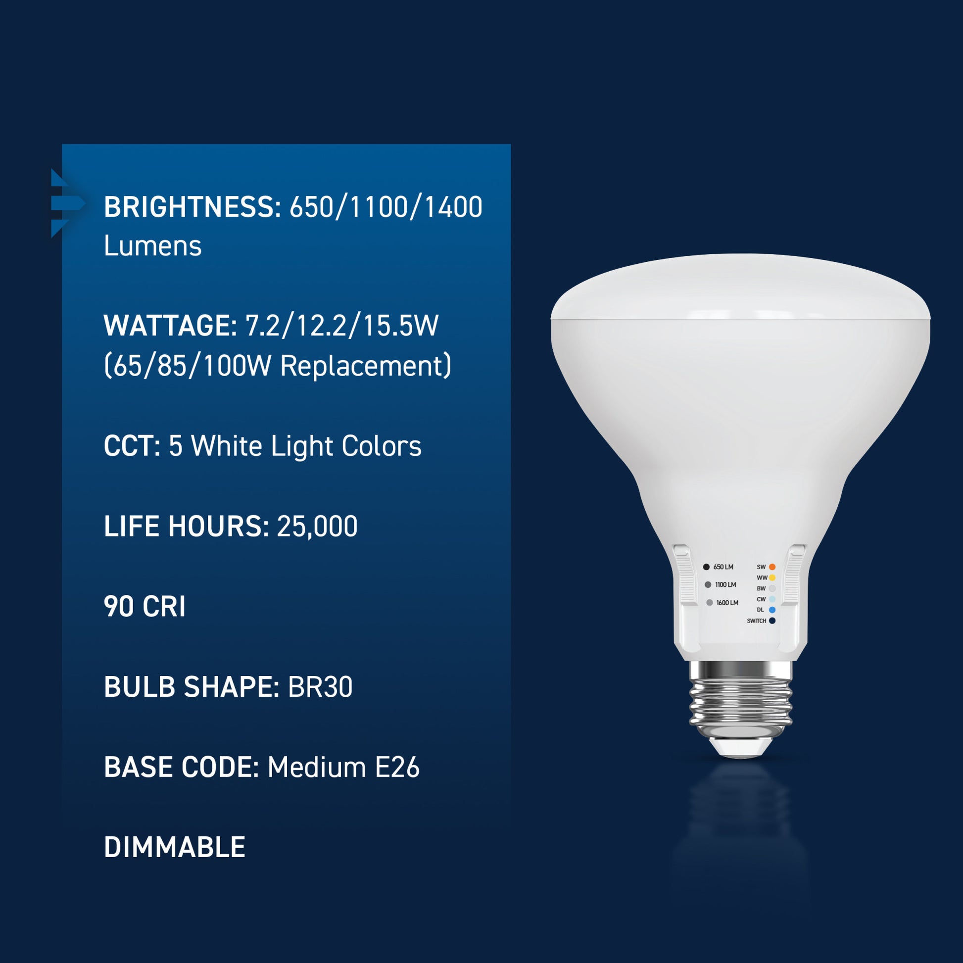 Ultimate versatility is at your fingertips with this All-In-One Bulb, the only bulb you'll ever need. Featuring Adjustable Brightness, choose between 650, 1100, and 1400 Lumens, so the brightness is just right at any time of day or night and matches your existing lighting. Preset Soft White (2700K), Warm White (3000K), Bright White (3500K), Cool White (4000K), or Daylight (5000K) before installation, or choose Switch Mode to use your wall switch to go from energizing light in the daytime to relaxing light at night. Low Blue technology filters out harsh blue light that can cause eye strain, headaches, and disrupt sleep. The medium-sized E26 base makes for a convenient upgrade in almost any fixture or lamp, and the brilliant 90+ Color Rendering Index (CRI) makes the colors in your home appear more vivid and true-to-life, enhancing the beauty of your décor. Built to last with an impressive 25,000-hour lifespan, this energy-efficient LED saves you money and time, reducing replacements and energy costs compared to traditional incandescent bulbs. Whether it's inside or outside, in recessed or track lighting fixtures, illuminate your world with a bulb that combines comfort, clarity, and reliability in one brilliant package.