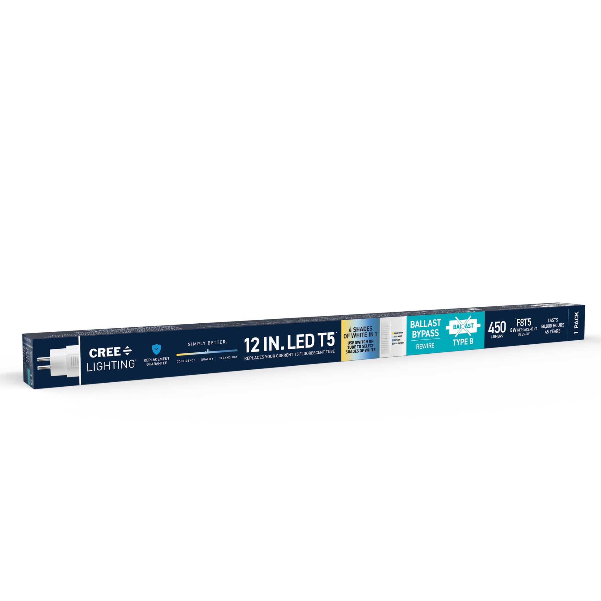 Upgrade your lighting game with Cree Lighting’s 12in LED Light Tube, a perfect replacement for T5 fluorescent bulbs in almost any commercial or business environment. This tube is a Type B Ballast Bypass that uses direct wiring and requires less maintenance over time. Set your color temperature on the bulb before installation to get the right light for your space – 3000K Warm White, 4000K Cool White, 5000K Daylight, or 6500K Cool Daylight. LED light turns on instantly without the warmup time required by fluorescents. This 450 Lumen non-dimmable tube uses just 6W of electricity, with cool running performance for its entire 50,000-hour lifespan. Whether it’s in the garage, storage unit, warehouse, or office, enjoy flicker-free, mercury-free lighting built to last.