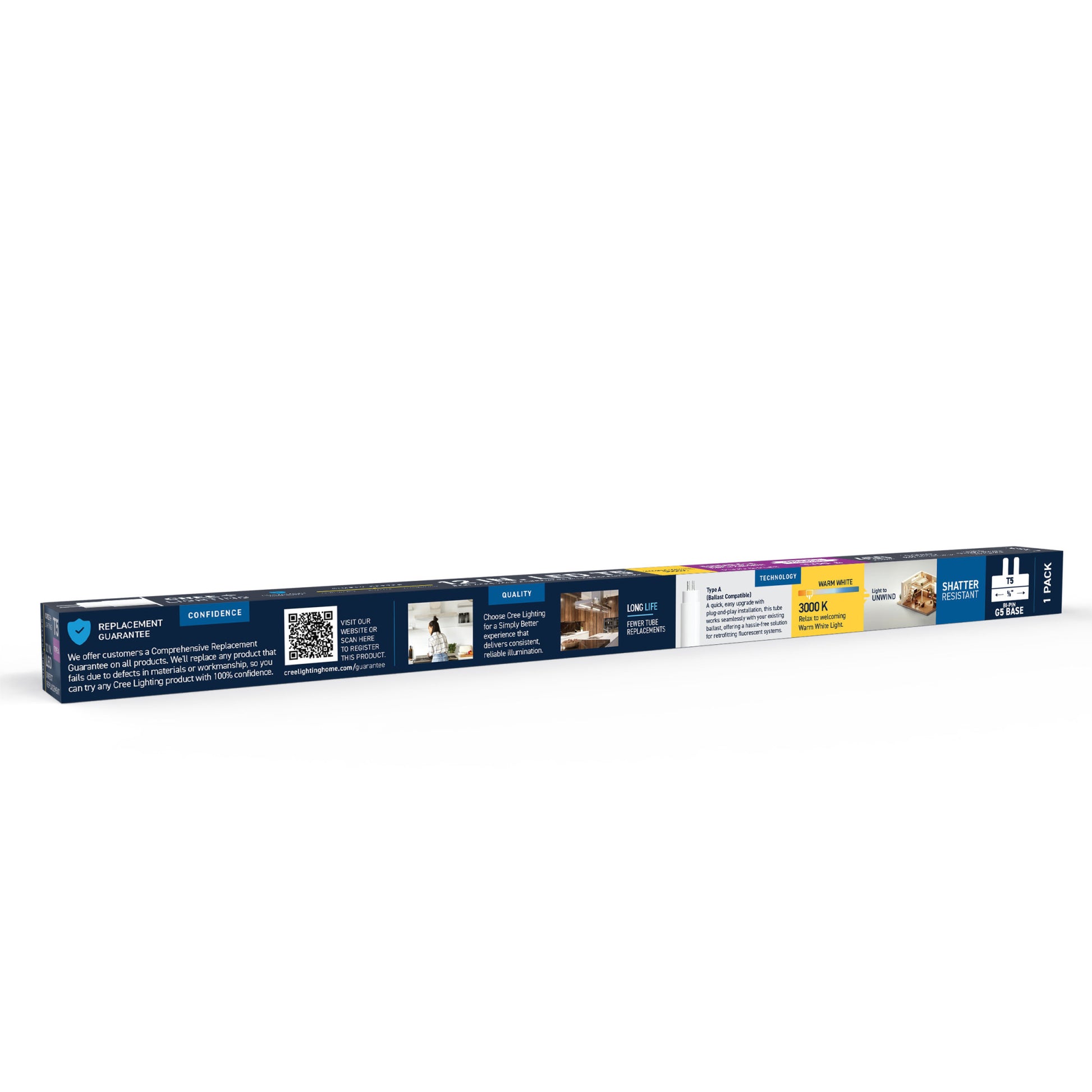 Upgrade your lighting game with Cree Lighting’s 12in LED Light Tube, a perfect replacement for T5 fluorescent bulbs in almost any commercial or business environment. This tube is a Type A Direct Replacement that works with most existing electronic ballasts for quick and easy plug-and-play installation, no rewiring required. 3000K Warm White light creates a relaxed, welcoming environment in any room. LED light turns on instantly without the warmup time required by fluorescents. This 450 Lumen non-dimmable tube uses just 6W of electricity, with cool running performance for its entire 35,000-hour lifespan. Its bi-pin base makes for easy installation and upgrades. Whether it’s in the garage, storage unit, warehouse, or office, enjoy flicker-free, mercury-free lighting built to last.
