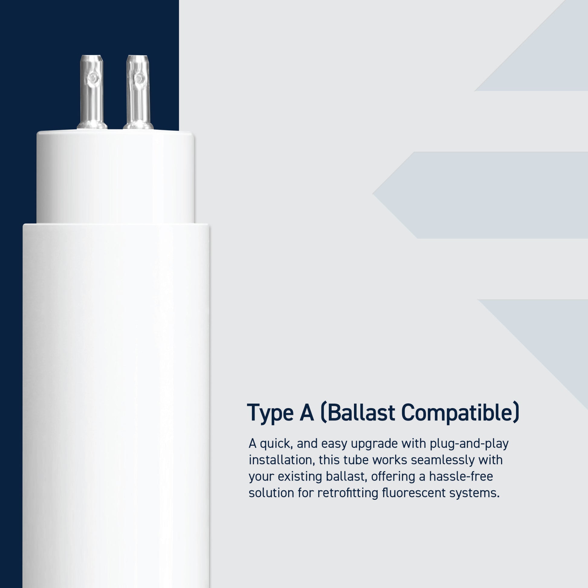 - Type A Direct Replacement uses existing ballasts for easy installation, no hardwiring required