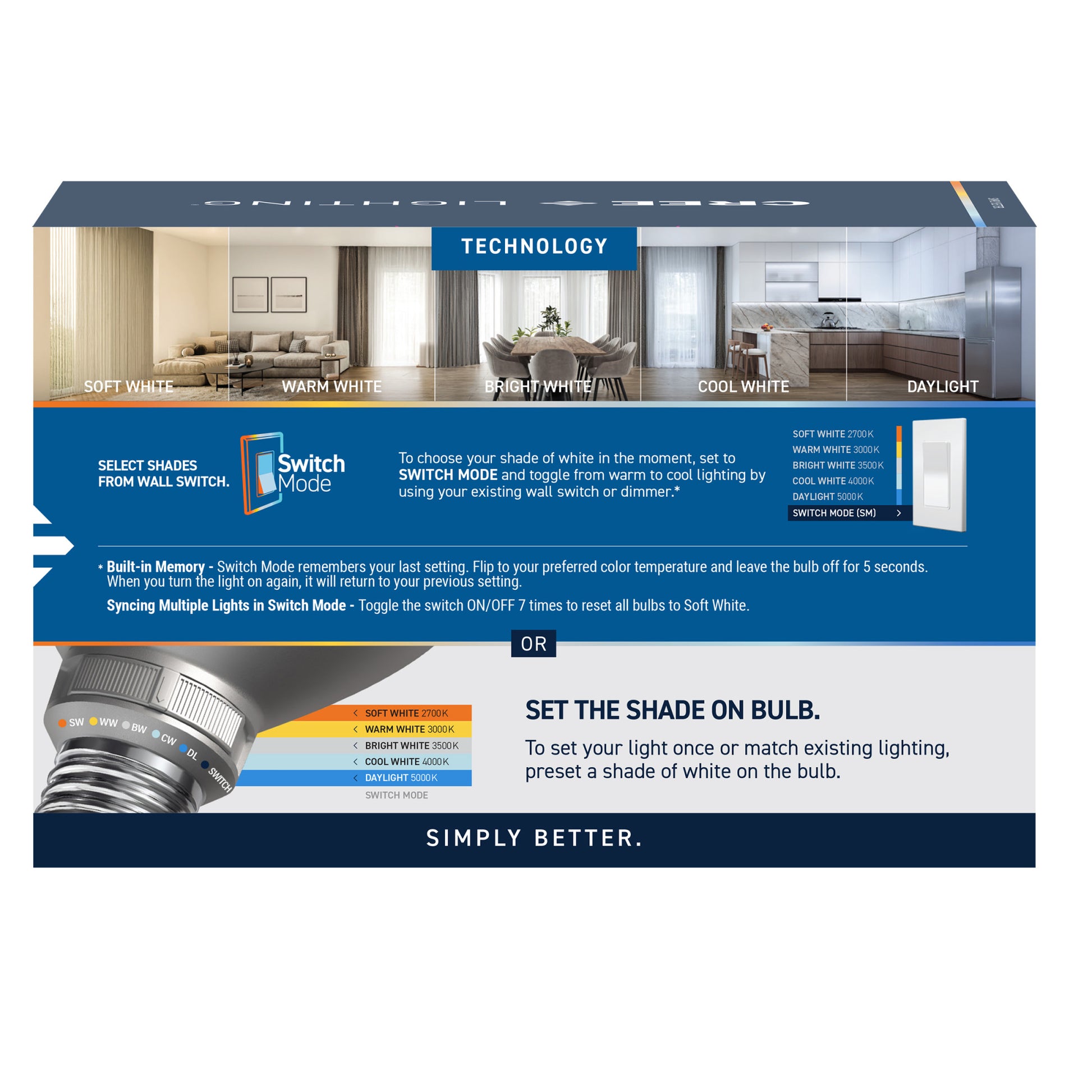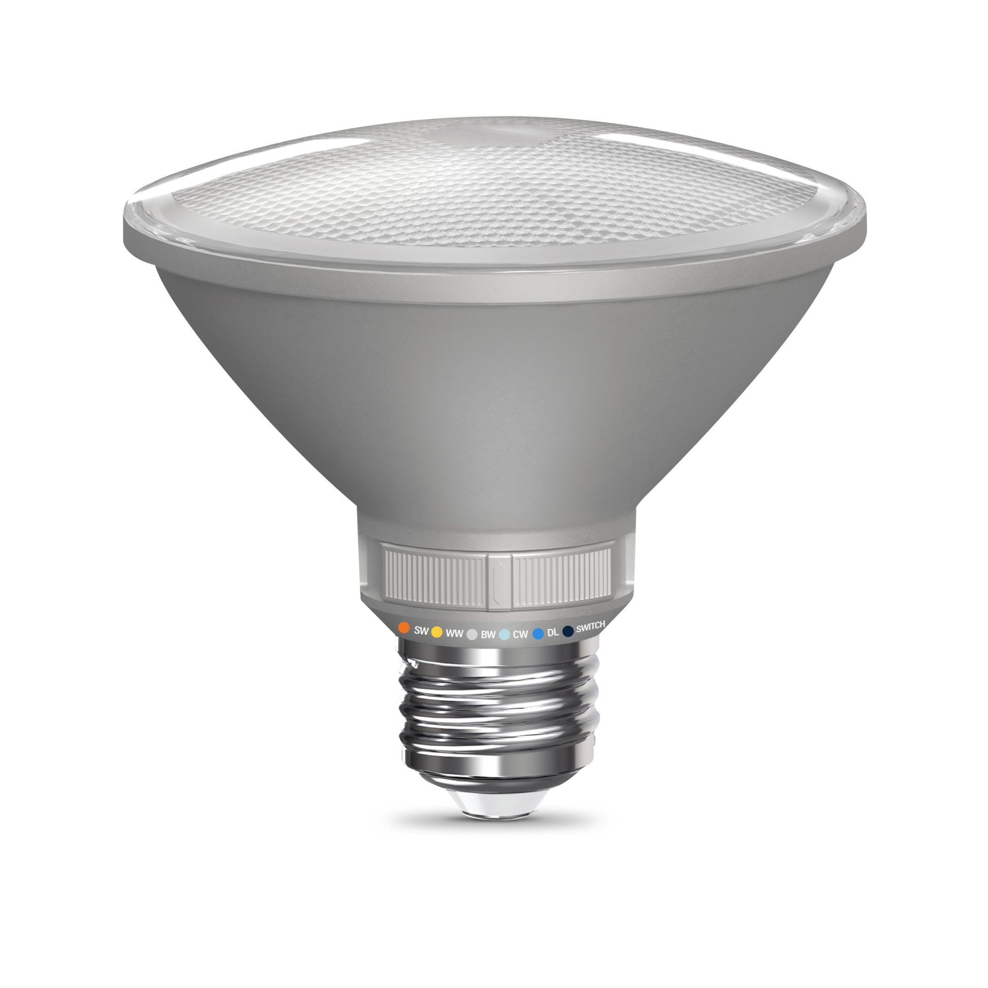 Upgrade your lighting game with our PAR30 Switchable White LED Bulb. Preset Soft White (2700K), Warm White (3000K), Bright White (3500K), Cool White (4000K), and Daylight (5000K) before installation or select Switch Mode to toggle between shades anytime with your existing wall switch. Low Blue technology filters out harsh blue light that can cause eye strain, headaches, and disrupt sleep. With a remarkable 90+ Color Rendering Index (CRI), colors appear more vivid and true-to-life, enhancing the beauty of your home’s décor and making everything look its best. Built to last with an impressive 25,000-hour lifespan, this energy-efficient LED saves you money and time, reducing replacements and energy costs compared to a traditional 75W incandescent bulb. With a medium-sized E26 base, this dimmable bulb provides an easy upgrade in most fixtures. Whether it’s in your playroom, patio, or living room, enjoy flicker-free, eco-friendly lighting that’s designed for sustainability.