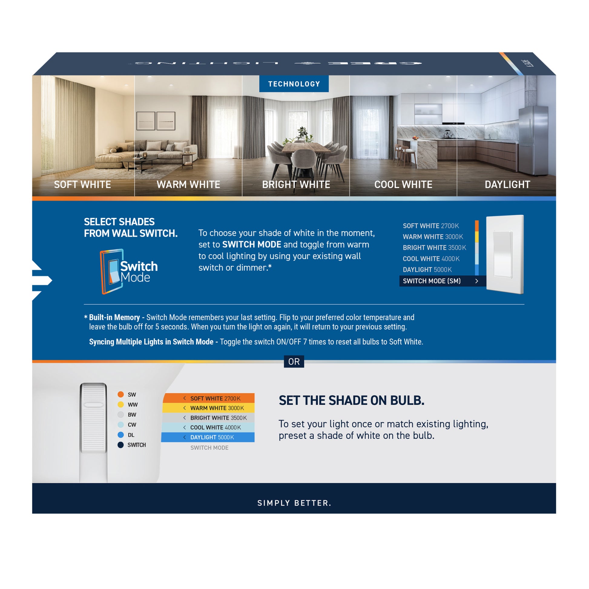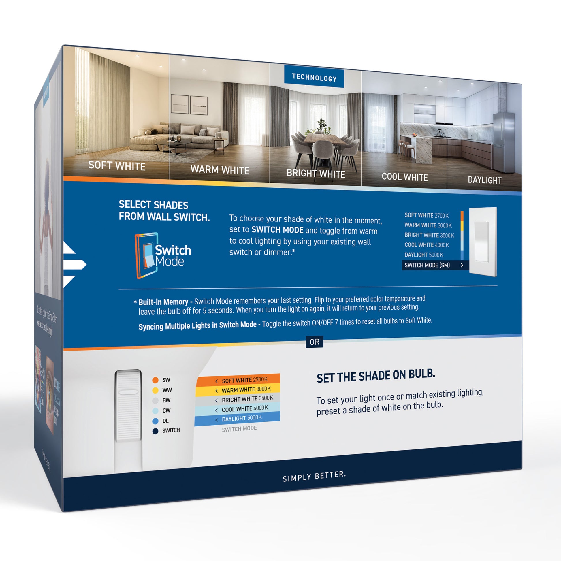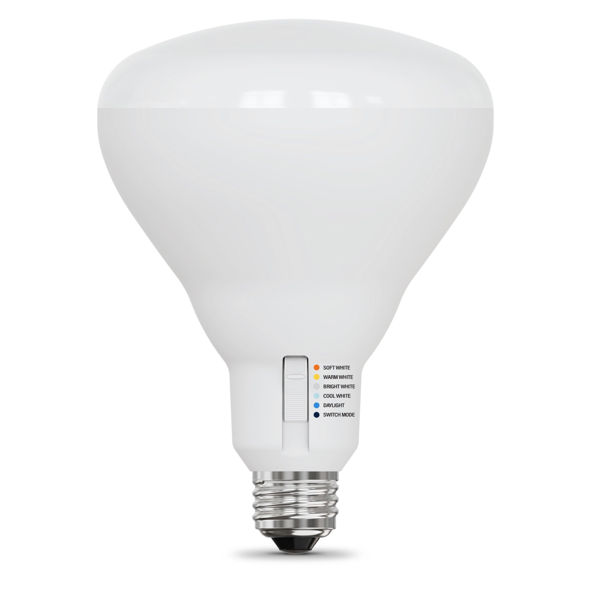Upgrade your lighting game with our BR40 5 Shades + Switch Mode LED Bulb, adaptable to any room, inside or out. Preset Soft White (2700K), Warm White (3000K), Bright White (3500K), Cool White (4000K), and Daylight (5000K) before installation or select Switch Mode to toggle between shades anytime with your existing wall switch. Low Blue technology filters out harsh blue light that can cause eye strain, headaches, and disrupt sleep. With a remarkable 90+ Color Rendering Index (CRI), colors appear more vivid and true-to-life, enhancing the beauty of your home’s décor and making everything look its best. Built to last with an impressive 25,000-hour lifespan, this energy-efficient LED saves you money and time, reducing replacements and energy costs compared to traditional 85W incandescent bulbs. Featuring a medium E26 base, it’s compatible with most fixtures, making upgrades effortless in your living spaces. The bulb's dimmable design lets you set the mood with a flick of your wall switch, whether it’s inside or outside, in recessed or track lighting fixtures. Illuminate your world with a bulb that combines comfort, clarity, and reliability in one brilliant package.