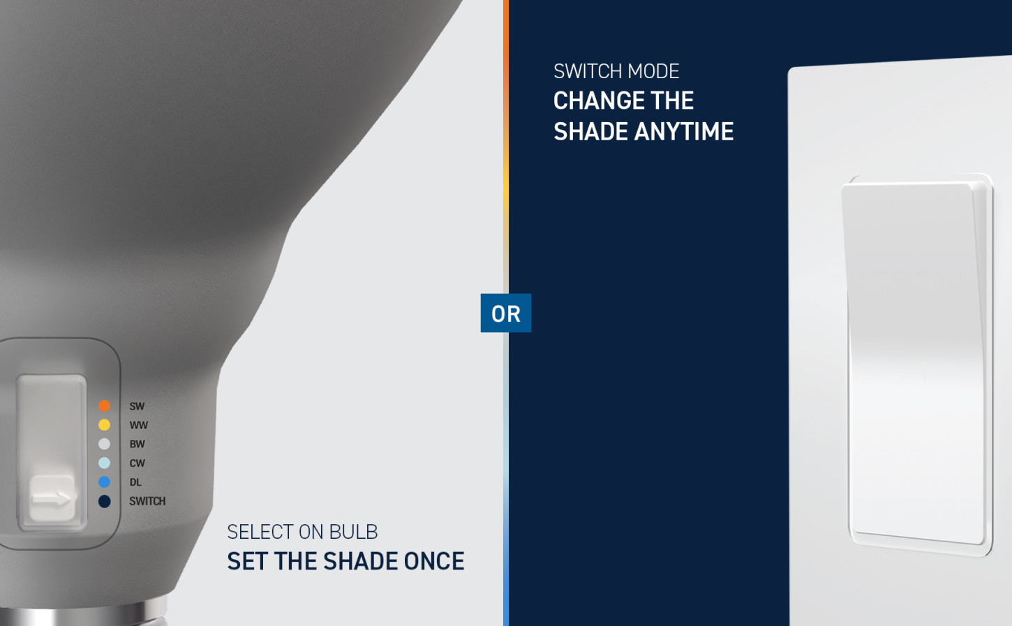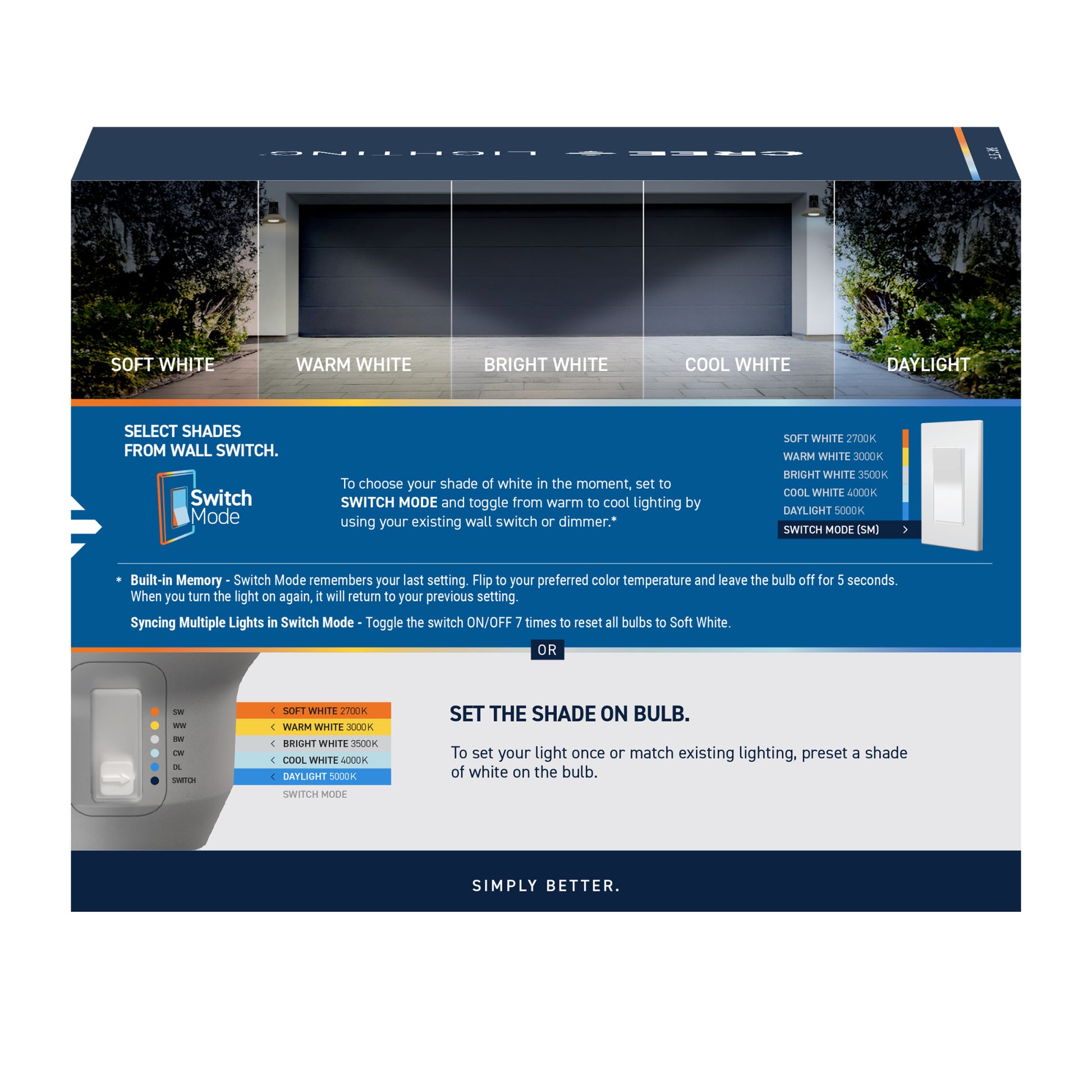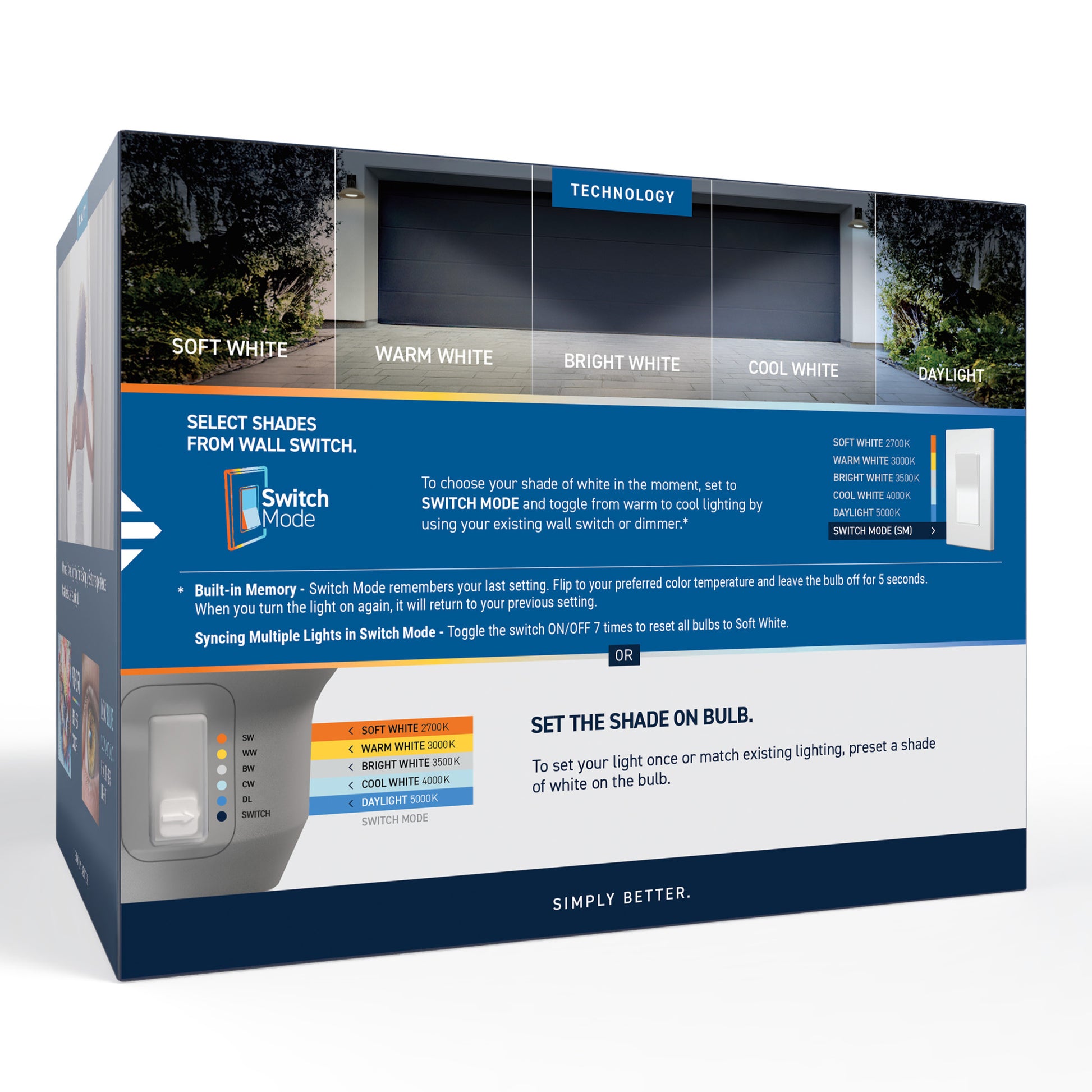 Upgrade your lighting game with our 5 Shade + Switch Mode White LED Bulb. Preset Soft White (2700K), Warm White (3000K), Bright White (3500K), Cool White (4000K), or Daylight (5000K) before installation, or choose Switch Mode to use your wall switch to go from energizing light in the daytime to relaxing light at night. Low Blue technology filters out harsh blue light that can cause eye strain, headaches, and disrupt sleep. With a remarkable 90+ Color Rendering Index (CRI), colors appear more vivid and true-to-life, enhancing the beauty of your home’s décor and making everything look its best. Built to last with an impressive 25,000-hour lifespan, this energy-efficient LED saves you money and time, reducing replacements and energy costs when compared to a traditional 90W incandescent bulb. With a medium-sized E26 base, this dimmable bulb provides an easy upgrade in most fixtures. Whether it’s your garage, foyer, or patio, enjoy flicker-free, eco-friendly lighting that’s mercury-free and designed for sustainability. Illuminate your world with a bulb that combines comfort, clarity, and reliability—all in one brilliant package.