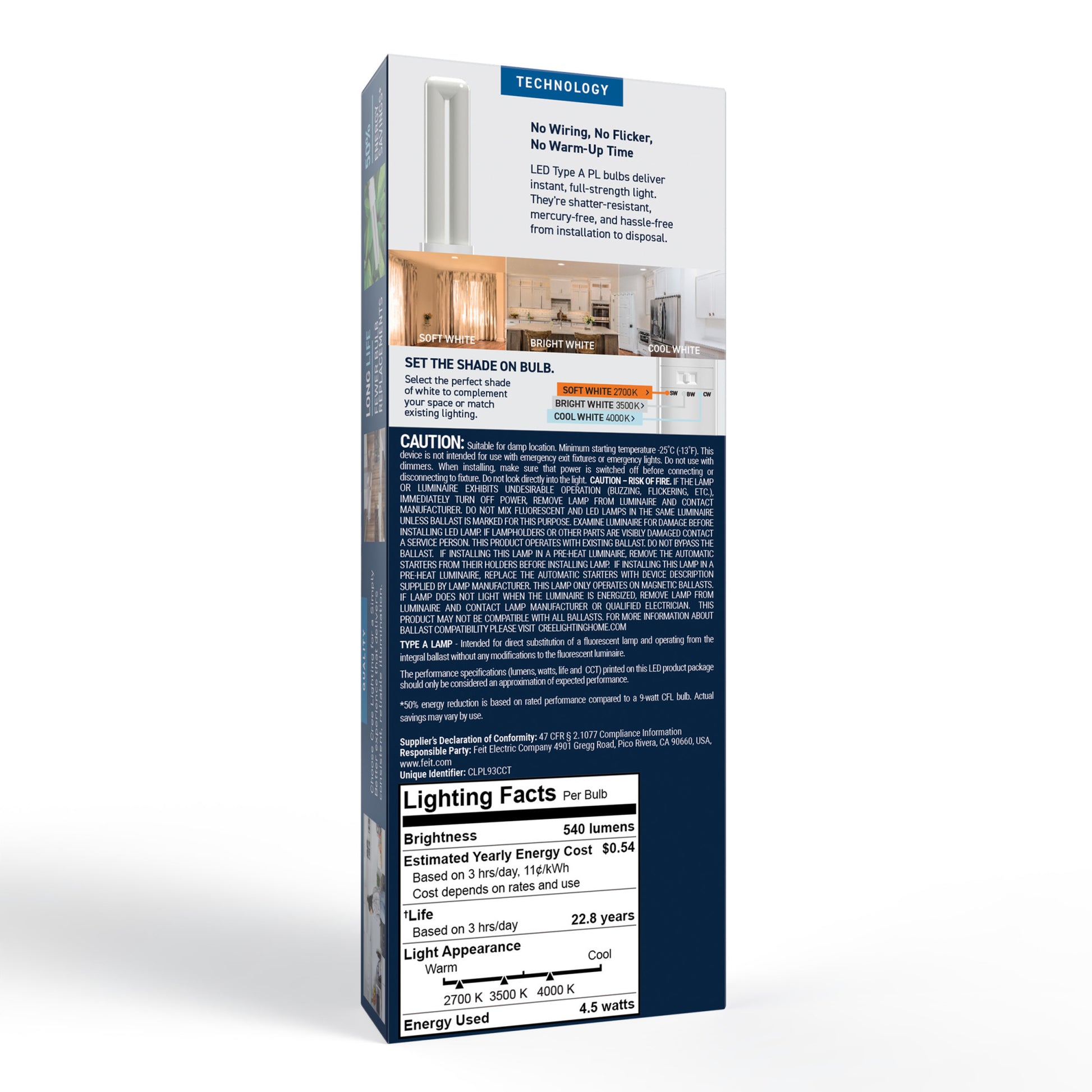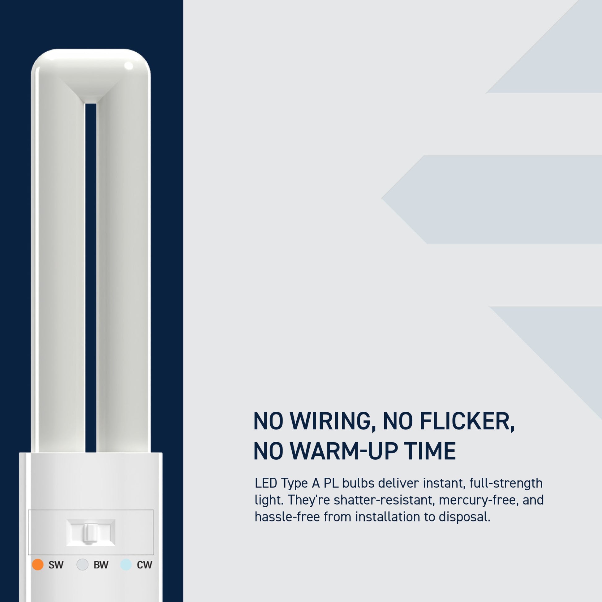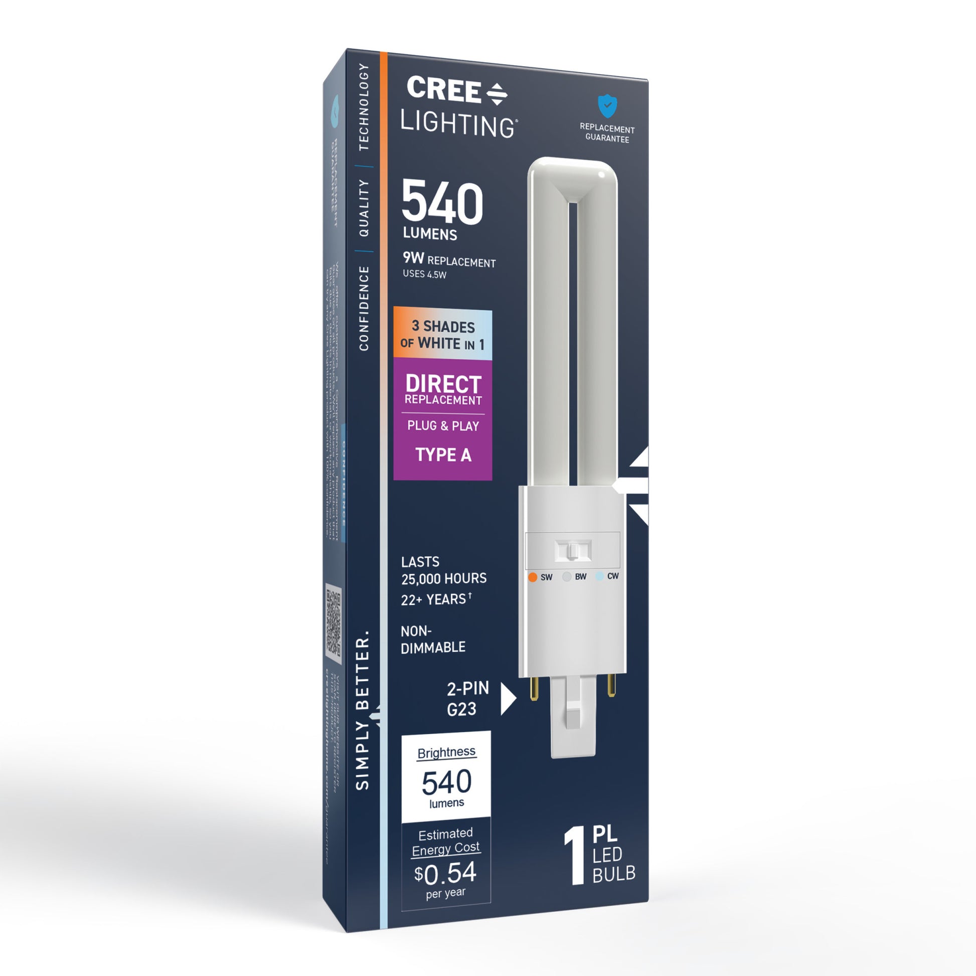 Customize your lighting with Cree Lighting’s 3 Shade 9W Replacement Twin Tube PL LED Bulb. With just 4.5 watts of power, this high-efficiency LED delivers big on brightness while letting you choose from three classic white light settings. Its G23 base fits seamlessly into most PL fixtures, providing an instant upgrade that’s easy on energy bills and eyes alike.